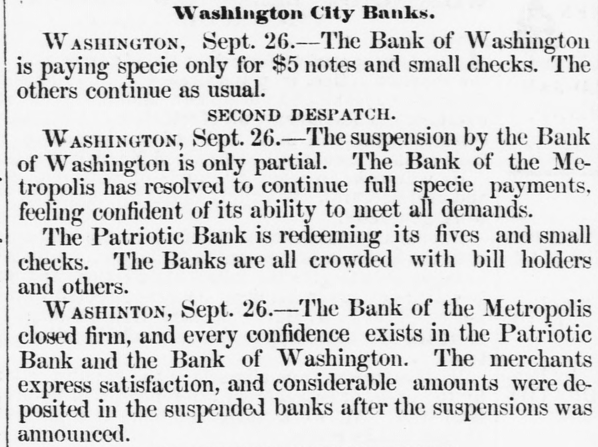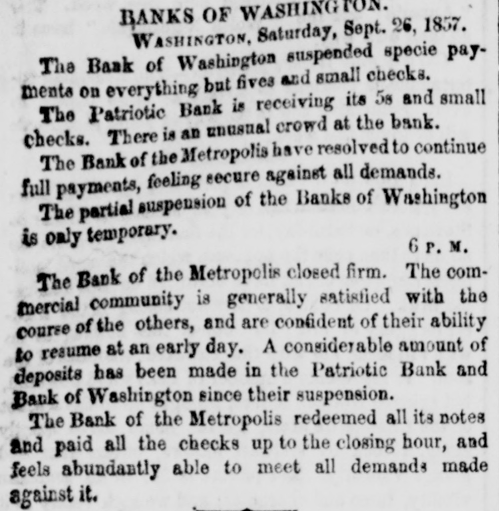 BANKS OF WASHINGTON WASHINGTON. Saturday, Sept. 26, 1857. The Bank of Washington suspended specie payments on everything but fives and small checks. The Patriotic Bank is receiving its 58 and small checks. There is an unusual crowd at the bank. The Bank of the Metropolis have resolved to continue full payments, feeling secure against all demands. The partial suspension of the Banks of Washington is only temporary. 6 P. M. The Bank of the Metropolis closed firm. The commercial community is generally satisfied with the course of the others, and are confident of their ability to resume at an early day. A considerable amount of deposits has been made in the Patriotic Bank and Bauk of Washington since their suspension. The Bank of the Metropolis redeemed all its notes and paid all the checks up to the closing hour, and feels abundantly able to meet all demands made against it.