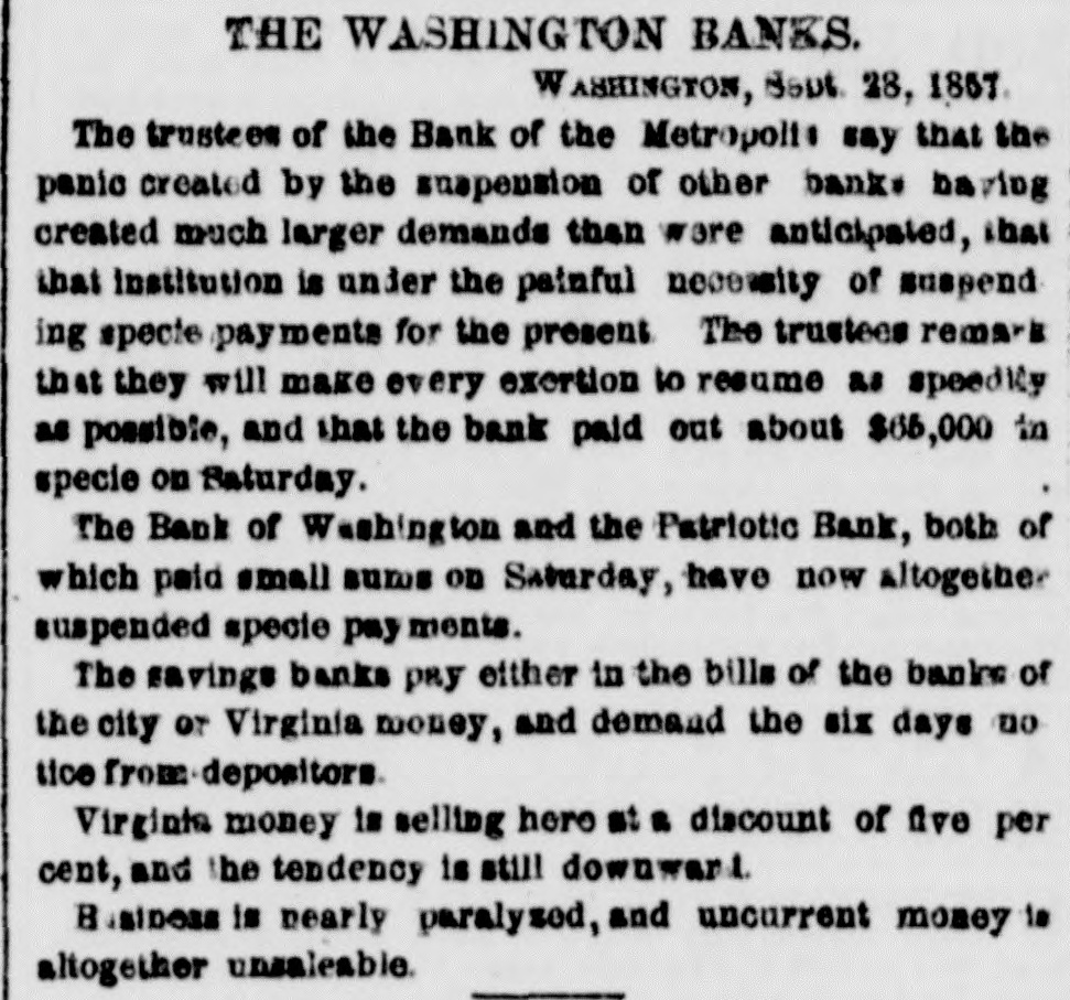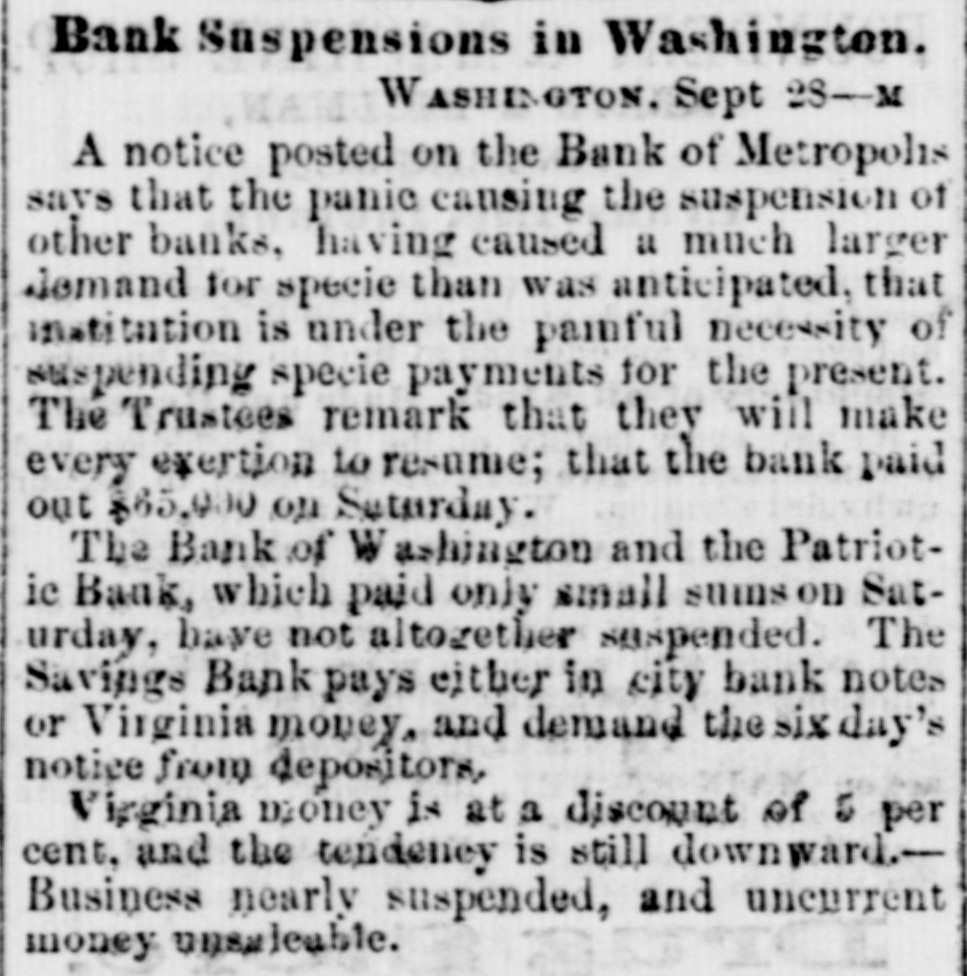 Bank Suspensions in Washington. WASHINGTON. Sept 23-M A notice posted on the Bank of Metropolis savs that the panic causing the suspension of other banks, having caused a much larger demand for specie than was anticipated, that institution is under the painful necessity of suspending specie payments for the present. The Trustees remark that they will make every exertion to resume; that the bank paid out $65,000 on Seturday. The Bank of W ashington and the Patriotic Bank, which paid only small sumson Saturday, have not altogether suspended. The Savings Bank pays either in city bank notes or Virginia money, and demand the six day's notice from depositors, Virginia money is at a discount of 5 per cent, and the tendency is still downward.Business nearly suspended, and uncurrent money unsalcable.
