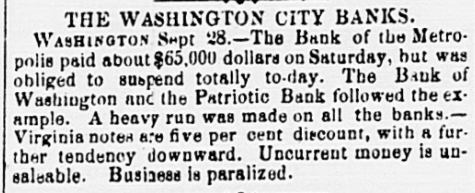 The Bank of the Metropolis paid about $65,000 on Saturday, but was obliged to suspend totally to-day. The Bank of the Washington and the Patriotic Bank followed the example. A heavy run was made on all the banks.