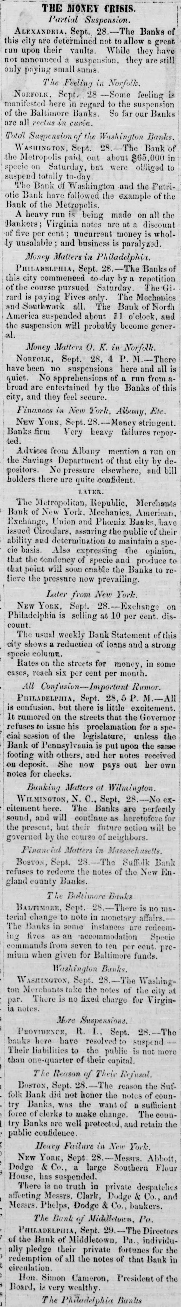 Partial Suspension. ALEXANDRIA. Sept. 28.-The Banks of this city are determined not to allow a great run upon their vaults. While they have not announced a suspension, they are still only paying small sums. The Feeling in Norfolk. NORFOLK, Sept. 28 -Some feeling is manifested here in regard to the suspension of the Baltimore Banks. So far our Banks are all rectus in curia. Total Suspension of the Washington Banks. WASHINGTON, Sept. 28.-The Bank of the Metropolis paid out about $65,000 in specie on Saturday, but were obliged to suspend totally to-day. The Bank of Washington and the Patriotic Bank have followed the example of the Bank of the Metropolis. A heavy run is being made on all the Bankers; Virginia notes are at a discount of five per cent uncurrent money is wholdy unsalable; and business is paralyzed. Money Matters in Philadelphia. PHILADELPHIA, Sept. 28.-The Banks of this city commenced to-day by a repetition of the course pursued Saturday. The Girard is paying Fives only. The Mechanics and Southwark all. The Bank of North America suspended about 11 o'clock, and the suspension will probably become general. Money Matters 0. K. in Norfolk. NORFOLK, Sept. 28, 4 P. M.-There have been no suspensions here and all is quiet. No apprehensions of a run from abroad are entertained by the Banks of this city, and they feel secure. Finances in New York, Albany, Etc. NEW YORK, Sept. 28.-Money stringent. Banks firm Very beavy failures reported. Advices from Albany mention a run on the Savings Department of that city by depositors. No pressure elsewhere, and bill holders there are quite confident. LATER. The Metropolitan, Republic, Merchants Bank of New York, Mechanics, American, Exchange, Union and Phoenix Banks, have issued Circulars, assuring the public of their ability and determination to maintain a specie basis. Also expressing the opinion, that the tendency of specie and produce to that point will soon enable the Banks to relieve the pressure now prevailing. Later from New York. NEW YORK, Sept. 28.--Exchange on Philadelphia is selling at 10 per cent. discount. The usual weekly Bank Statement of this city shows a reduction of loans and a strong specie column. Rates on the streets for money, in some cases, reach six per cent per month. All Confusion-Importent Rumor. Philadelphia, Sept. 28, 5 P. M.-All is confusion, but there is little excitement. It rumored on the streets that the Governor refuses to issue his proclamation for a special session of the legislature, unless the Bank of Pennsylvania is put upon the same footing with others, and her notes received on deposit. She now pays out her own notes for checks. Banking Matters at Wilmington. WILMINGTON, N. C., Sept, 28.-No excitement here. The Banks are perfectly sound, and will continue as heretofore for the present, but their future action will be governed by the course of neighbors. Financial Matters in Massachusetts. BOSTON, Sept. 28.-The Suffolk Bank refuses to redeem the notes of the New England county Banks. The Baltimore Banks BALTIMORE, Sept. 28.-There is no material change to note in monetary affairs.The Banks in some instances are redeeming fives as an accommodation Specie commands from seven to ten per cent. premium when given for Baltimore funds. Washington Banks. WASHINGTON, Sept. 28.-The Washington Merchants take the notes of the city at par. There is no fixed charge for Virginia notes. More Suspensions. PROVIDENCE, R. I., Sept. 28.-The banks here have resolved to suspend Their liabilities to the public is not more than one-quarter of their capital. The Reason of Their Refusal. BOSTON, Sept. 28.-The reason the Suffolk Bank did not honor the notes of country Banks, was the want of a sufficient force of clerks to make change. The country Banks are well protected, and retain the public confidence. Heavy Failure in New York. NEW YORK, Sept. 28.-Messrs. Abbott, Dodge & Co., a large Southern Flour House, has suspended. There is no truth in private despatches affecting Messrs. Clark, Dodge & Co., and Messrs. Phelps, Dodge & Co., bankers. The Bank of Middlletown, Pa. PHILADELPHIA, Sept. 29.-The Directors of the Bank of Middletown. Pa individu-