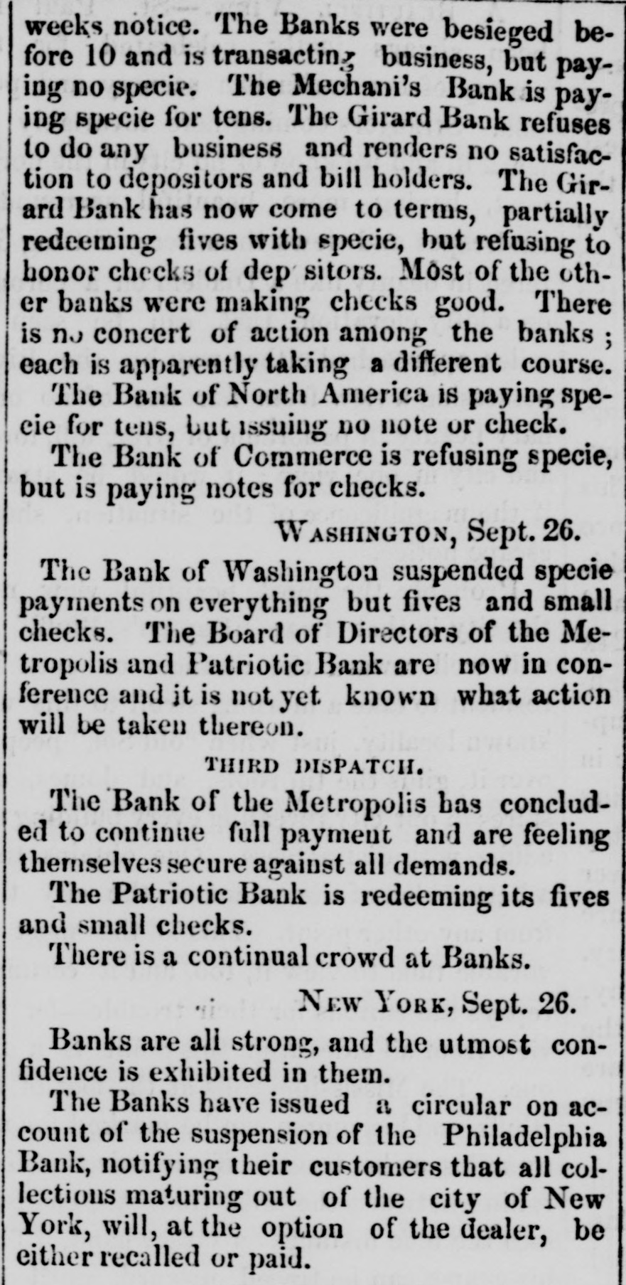 weeks notice. The Banks were besieged before 10 and is transacting business, but paying no specie. The Mechani's Bank is paying specie for tens. The Girard Bank refuses to do any business and renders no satisfaction to depositors and bill holders. The Girard Bank has now come to terms, partially redeeming fives with specie, but refusing to honor checks of dep sitors. Most of the other banks were making checks good. There is no concert of action among the banks ; each is apparently taking a different course. The Bank of North America is paying specie for tens, but issuing no note or check. The Bank of Commerce is refusing specie, but is paying notes for checks. ASHINGTON, Sept. 26. The Bank of Washington suspended specie payments on everything but fives and small checks. The Board of Directors of the Metropolis and Patriotic Bank are now in conference and it is not yet known what action will be taken thereon. THIRD DISPATCH. The Bank of the Metropolis has concluded to continue full payment and are feeling themselves secure against all demands. The Patriotic Bank is redeeming its fives and small checks. There is a continual crowd at Banks. NEW YORK, Sept. 26. Banks are all strong, and the utmost confidence is exhibited in them. The Banks have issued a circular on account of the suspension of the Philadelphia Bank, notifying their customers that all collections maturing out of the city of New York, will, at the option of the dealer, be either recalled or paid.