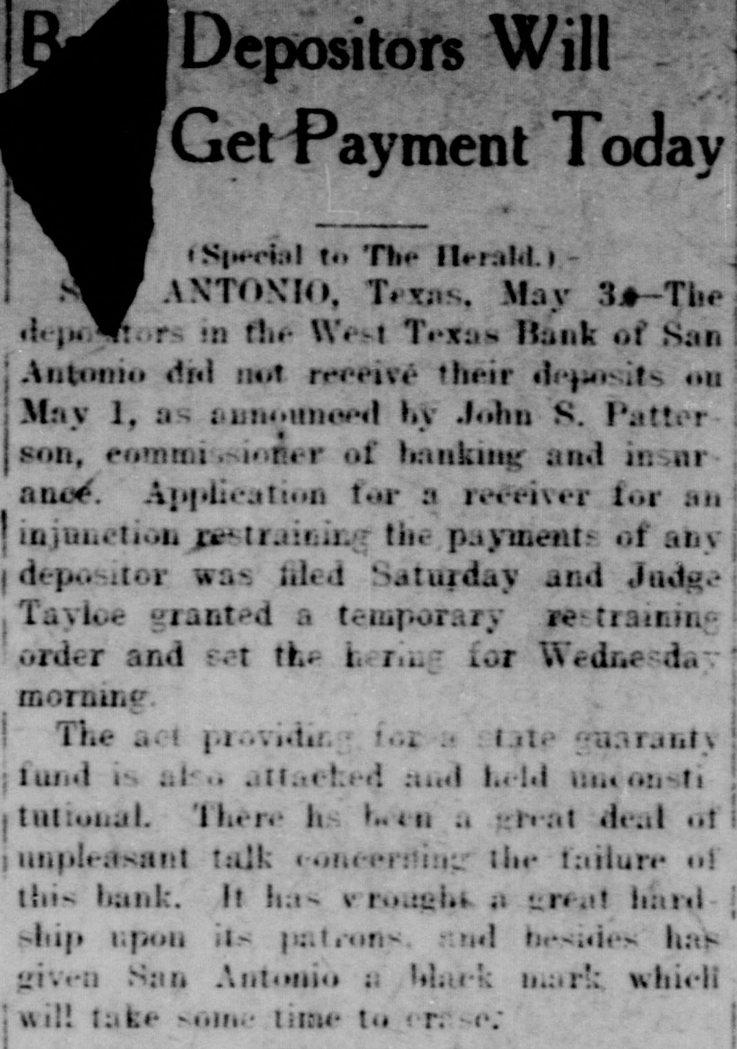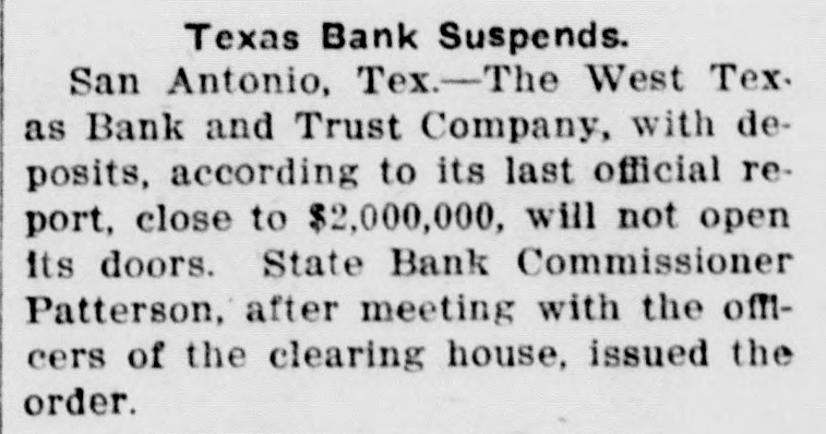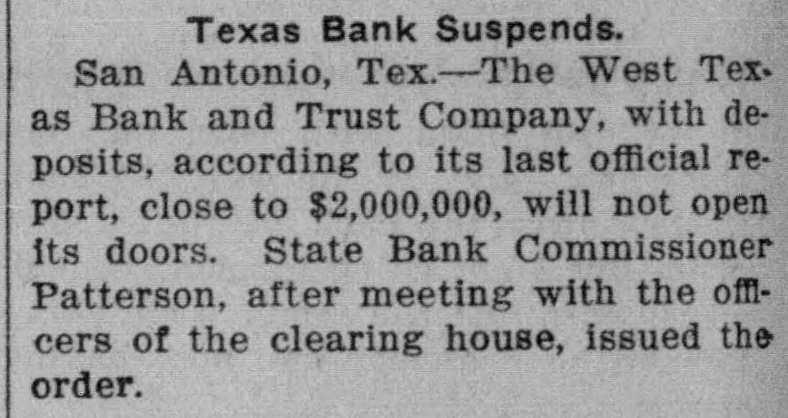 Texas Bank Suspends. San Antonio, Tex.-The West Tex. as Bank and Trust Company, with deposits, according to its last official report, close to $2,000,000, will not open its doors. State Bank Commissioner Patterson, after meeting with the offlcers of the clearing house, issued the order.
