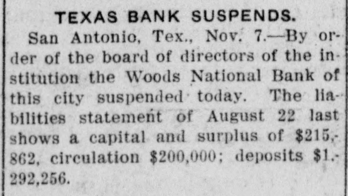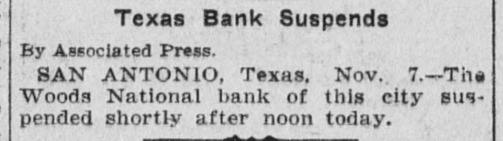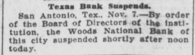 Texas Bank Suspends By Associated Press. SAN ANTONIO, Texas, Nov. 7.-The Woods National bank of this city suspended shortly after noon today.