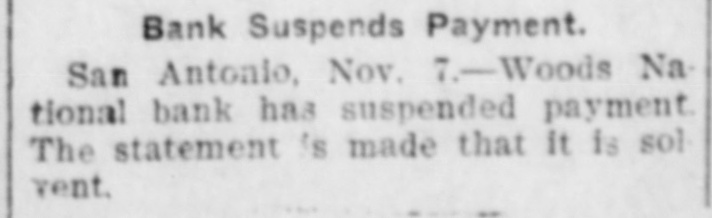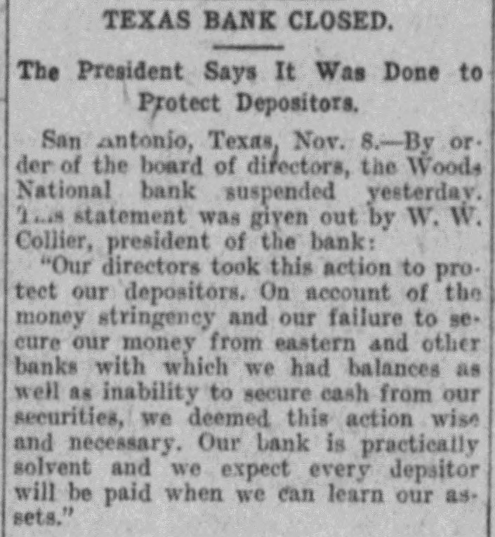 TEXAS BANK CLOSED. The President Says It Was Done to Protect Depositors. San Antonio, Texas, Nov. 8.-By order of the board of directors, the Woods National bank suspended yesterday. This statement was given out by W. w. Collier, president of the bank: "Our directors took this action to protect our depositors. On account of the money stringency and our failure to secure our money from eastern and other banks with which we had balances as well as inability to secure cash from our securities, we deemed this action wise and necessary. Our bank is practically solvent and we expect every depsitor will be paid when we can learn our assets."