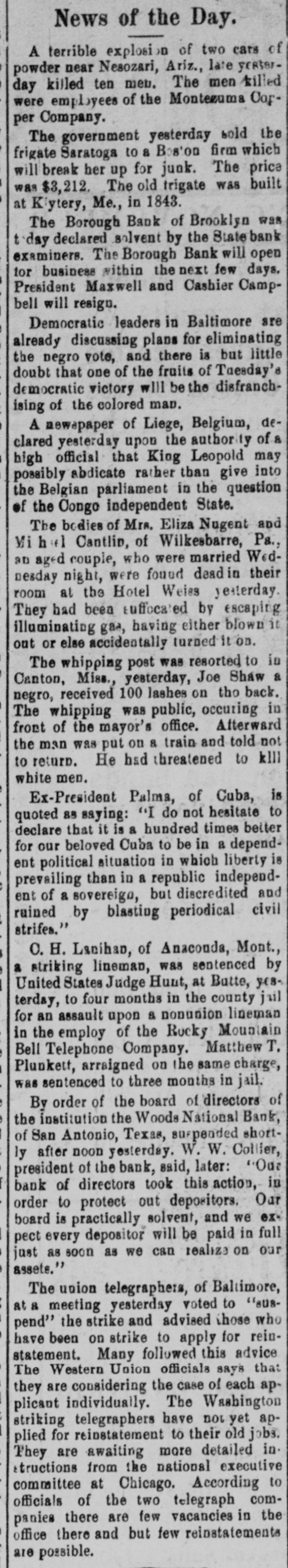 News of the Day. A terrible explosion of two cars of powder near Nesozari, Ariz., late yeaterday killed ten men. The men killed were employees of the Montezuma Copper Company. The government yesterday sold the frigate Saratoga to a Boston firm which will break her up for junk. The price was $3,212. The old trigate was built at Kiytery, Me., in 1843. The Borough Bank of Brooklyn was t day declared solvent by the State bank examiners. The Borough Bank will open for business within the next few days. President Maxwell and Cashier Campbell will resign. Democratic leaders in Baltimore are already discussing plans for eliminating the negro vote, and there is but little doubt that one of the fruits of Tuesday's democratic victory will be the disfranchising of the colored man. A newspaper of Liege, Belgium, declared yesterday upon the authority of & high official that King Leopold may possibly abdicate rather than give into the Belgian parliament in the question of the Congo independent State. The bodies of Mrs. Eliza Nugent and Mi had Cantlin, of Wilkesbarre, Pa., an aged couple, who were married Wednesday night, were found deadin their room at the Hotel Weies yesterday. They had been suffocated by escaping illuminating gas, having either blown it out or else accidentally turned it on. The whipping post was resorted to in Canton, Miss., yesterday, Joe Shaw a negro, received 100 lashes on tho back. The whipping was public, occuring in front of the mayor's office. Afterward the man was put on a train and told not to return. He had threatened to klll white men. Ex-President Palma, of Cuba, is quoted as saying: "I do not hesitate to declare that it is a hundred times better for our beloved Cuba to be in a dependent political situation in which liberty is prevailing than in a republic independent of a sovereigo, but discredited and ruined by blasting periodical civil strifes." O. H. Lanihan, of Anaconda, Mont., a striking lineman, was sentenced by United States Judge Hunt, at Butte, yesterday, to four months in the county jail for an assault upon 8 nonunion lineman in the employ of the Rocky Mountain Bell Telephone Company. Matthew T. Plunkett, arraigned on the same charge, was sentenced to three months in jail. By order of the board of directors of the institution the Woods National Bank, of San Antonio, Texas, suspended shortly after noon yesterday. W. W. Collier, president of the bank, said, later: "Our bank of directors took this action, in order to protect out depositors. Our board is practically solvent, and we expect every depositor will be paid in full just as soon as we can realize on our assets." The union telegraphers, of Baltimore, at a meeting yesterday voted to "suspend" the strike and advised those who have been on strike to apply for reinstatement. Many followed this advice The Western Union officials says that they are considering the case of each applicant individually. The Washington striking telegraphers have not yet applied for reinstatement to their old jobs. They are awaiting more detailed in. structions from the national executive committee at Chicago. According to officials of the two telegraph companies there are few vacancies in the office there and but few reinstatements are possible.