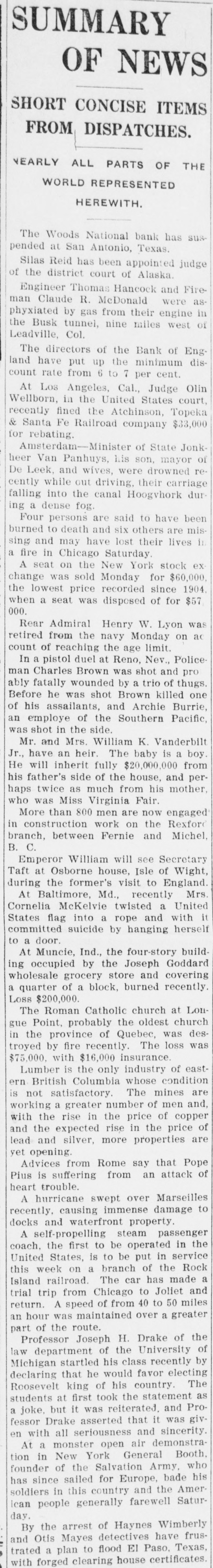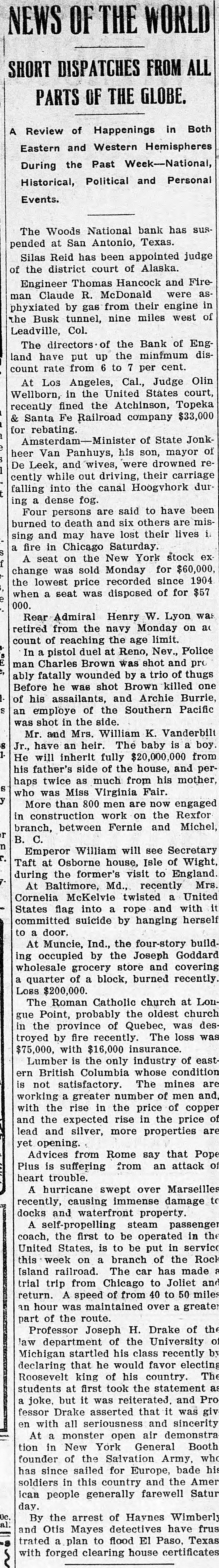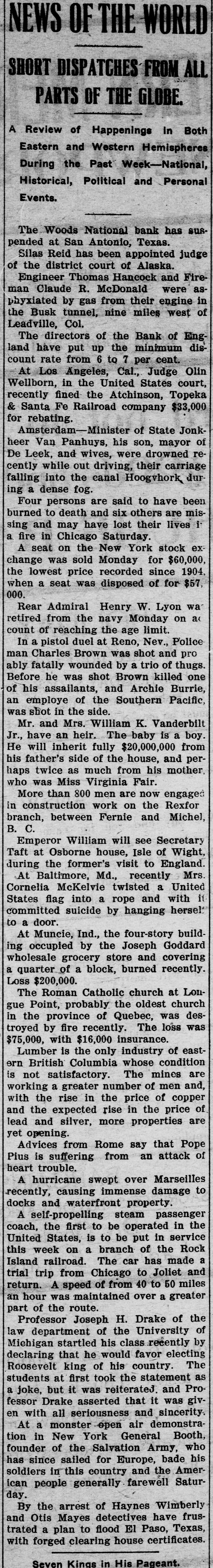 NEWS OF THE WORLD SHORT DISPATCHES FROM ALL PARTS OF THE GLOBE. A Review of Happenings In Both Eastern and Western Hemispheres During the Past Week-National, Historical, Political and Personal Events. The Woods National bank has suspended at San Antonio, Texas. Silas Reid has been appointed judge of the district court of Alaska. Engineer Thomas Hancock and Fireman Claude R. McDonald were asphyxiated by gas from their engine in the Busk tunnel, nine miles west of Leadville, Col. The directors of the Bank of England have put up the minimum discount rate from 6 to 7 per cent. At Los Angeles, Cal., Judge Olin Wellborn, in the United States court, recently fined the Atchinson, Topeka & Santa Fe Railroad company $33,000 for rebating Amsterdam-Minister of State Jonkheer Van Panhuys, his son, mayor of De Leek, and wives, were drowned recently while out driving, their carriage falling into the canal Hoogvhork dur ing a dense fog. Four persons are said to have been burned to death and six others are missing and may have lost their lives it a fire in Chicago Saturday. A seat on the New York stock exchange was sold Monday for $60,000, the lowest price recorded since 1904. when a seat was disposed of for $57, 000. Rear Admiral Henry W. Lyon wa retired from the navy Monday on a( count of reaching the age limit. In a pistol duel at Reno, Nev., Police man Charles Brown was shot and pro ably fatally wounded by a trio of thugs. Before he was shot Brown killed one of his assailants, and Archie Burrie, an employe of the Southern Pacific, was shot in the side. Mr. and Mrs. William K. Vanderbilt Jr., have an heir. The baby is a boy. He will inherit fully $20,000,000 from his father's side of the house, and perhaps twice as much from his mother, who was Miss Virginia Fair. More than 800 men are now engaged in construction work on the Rexfor branch, between Fernie and Michel, B. C. Emperor William will see Secretary Taft at Osborne house, Isle of Wight, during the former's visit to England. At Baltimore, Md., recently Mrs. Cornelia McKelvie twisted a United States flag into a rope and with it committed suicide by hanging hersel to a door. At Muncie, Ind., the four-story building occupied by the Joseph Goddard wholesale grocery store and covering a quarter of a block, burned recently. Loss $200,000. The Roman Catholic church at Longue Point, probably the oldest church in the province of Quebec, was destroyed by fire recently. The loss was $75,000, with $16,000 insurance. Lumber is the only industry of eastern British Columbia whose condition is not satisfactory. The mines are working a greater number of men and, with the rise in the price of copper and the expected rise in the price of lead and silver, more properties are yet opening. Advices from Rome say that Pope Pius is suffering from an attack of heart trouble. A hurricane swept over Marseilles recently, causing immense damage to docks and waterfront property. A self-propelling steam passenger coach, the first to be operated in the United States, is to be put in service this week on a branch of the Rock Island railroad. The car has made a trial trip from Chicago to Joliet and return. A speed of from 40 to 50 miles an hour was maintained over a greater part of the route. Professor Joseph H. Drake of the law department of the University of Michigan startled his class recently by declaring that he would favor electing Roosevelt king of his country. The students at first took the statement as a joke, but it was reiterated. and Professor Drake asserted that it was given with all seriousness and sincerity. At a monster open air demonstration in New York General Booth, founder of the Salvation Army, who has since sailed for Europe, bade his soldiers in this country and the American people generally farewell Saturday. By the arrest of Haynes Wimberly and Otis Mayes detectives have frustrated a plan to flood El Paso, Texas, with forged clearing house certificates.