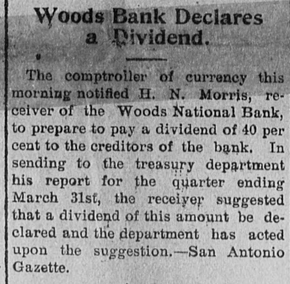 # Woods Bank Declares # a Dividend. The comptroller of currency this morning notified H. N. Morris, receiver of the Woods National Bank, to prepare to pay a dividend of 40 per cent to the creditors of the bank. In sending to the treasury department his report for the quarter ending March 31st, the receiver suggested that a dividend of this amount be declared and the department has acted upon the suggestion.—San Antonio Gazette.