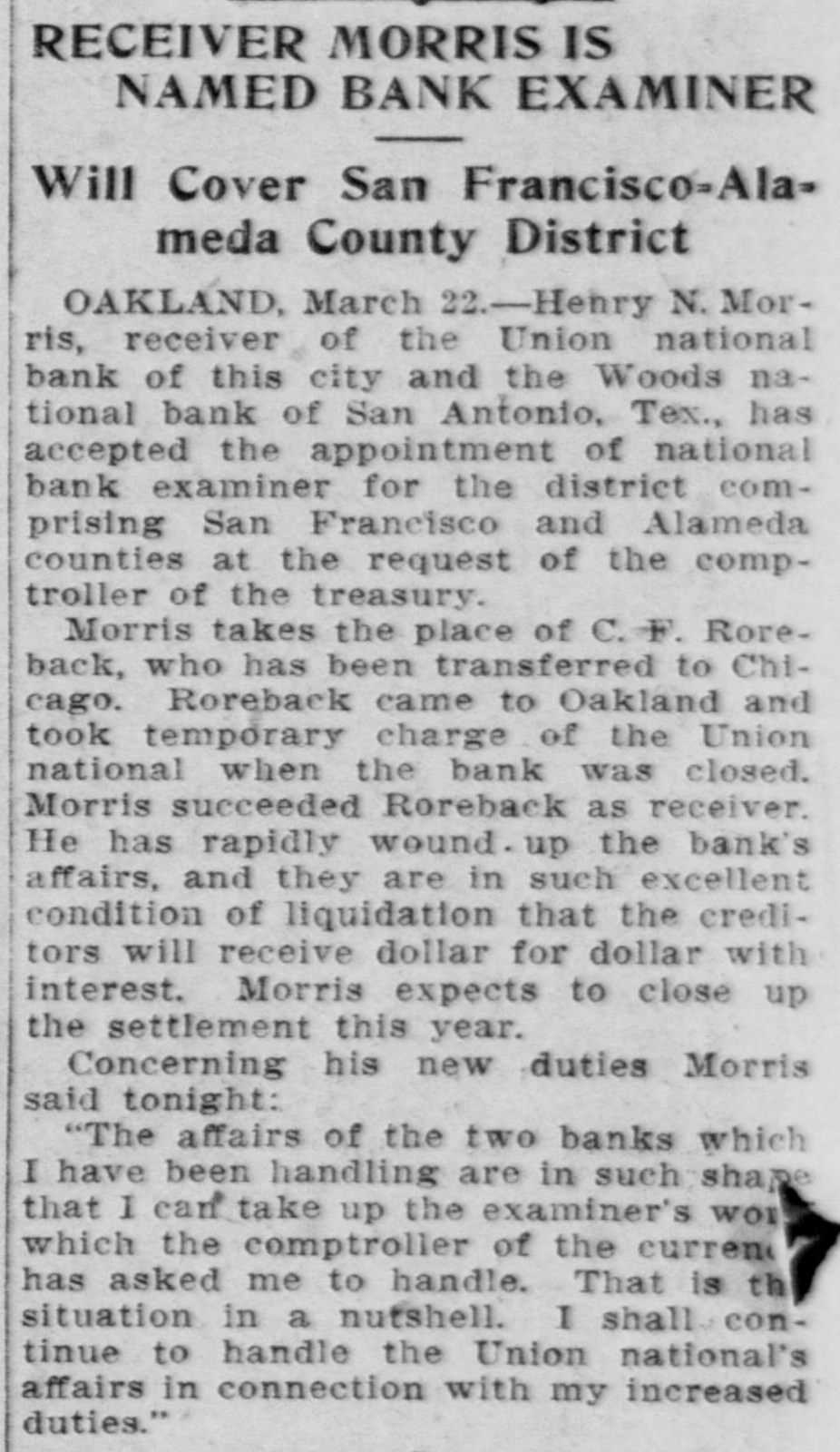RECEIVER MORRIS IS NAMED BANK EXAMINER Will Cover San Francisco-Alameda County District OAKLAND, March 22.-Henry N. Morris, receiver of the Union national bank of this city and the Woods national bank of San Antonio, Tex., has accepted the appointment of national bank examiner for the district comprising San Francisco and Alameda counties at the request of the comptroller of the treasury. Morris takes the place of C. F. Roreback, who has been transferred to Chicago. Roreback came to Oakland and took temporary charge of the Union national when the bank was closed. Morris succeeded Roreback as receiver. He has rapidly wound. up the bank's affairs, and they are in such excellent condition of liquidation that the creditors will receive dollar for dollar with interest. Morris expects to close up the settlement this year. Concerning his new duties Morris said tonight: "The affairs of the two banks which I have been handling are in such shape that I can take up the examiner's WOI which the comptroller of the current has asked me to handle. That is th situation in a nutshell. I shall sontinue to handle the Union national's affairs in connection with my increased duties."