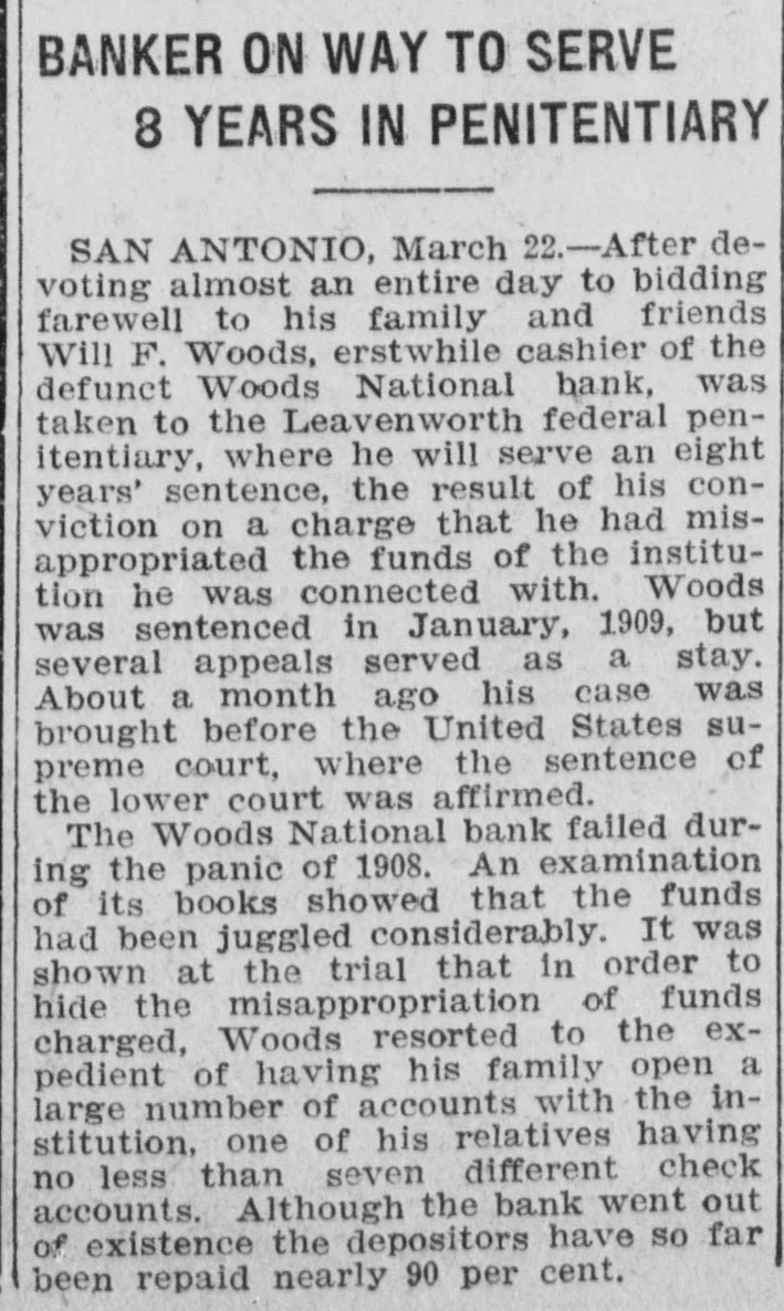 # BANKER ON WAY TO SERVE # 8 YEARS IN PENITENTIARY SAN ANTONIO, March 22.-After devoting almost an entire day to bidding farewell to his family and friends Will F. Woods, erstwhile cashier of the defunct Woods National bank, was taken to the Leavenworth federal penitentiary, where he will serve an eight years' sentence, the result of his conviction on a charge that he had misappropriated the funds of the institution he was connected with. Woods was sentenced in January, 1909, but several appeals served as a stay. About a month ago his case was brought before the United States supreme court, where the sentence of the lower court was affirmed. The Woods National bank failed during the panic of 1908. An examination of its books showed that the funds had been juggled considerably. It was shown at the trial that in order to hide the misappropriation of funds charged, Woods resorted to the expedient of having his family open a large number of accounts with the institution, one of his relatives having no less than seven different check accounts. Although the bank went out of existence the depositors have so far been repaid nearly 90 per cent.