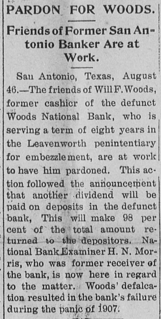 PARDON FOR WOODS. Friends of Former San Antonio Banker Are at Work. San Antonio, Texas, August 46.-The friends of WillF. Woods, former cashicr of the defunct Woods National Bank, who is serving a term of eight years in the Leavenworth penintentiary for embezzlement, are at work to have him pardoned. This action followed the announcement that another dividend will be paid on deposits in the defunct bank, This will make 98 per cent of the total amount returned to the depositors. National Bank Examiner H. N. Morris, who was former receiver of the bank, is now here in regard to the matter. Woods' defalcation resulted in the bank's failure during the panic of 1907.
