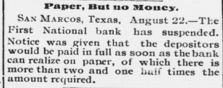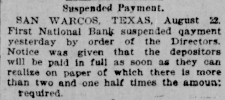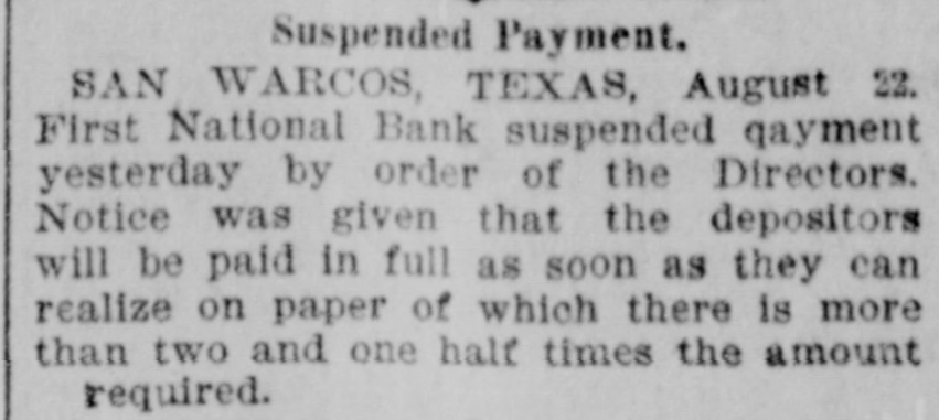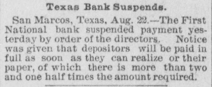 Contemporary newspapers report that the First National Bank of San Marcos suspended payment by order of its directors on Aug 22, 1893 because it could not realize on its paper (illiquid assets). Controller Eckels permitted the bank to reopen around Aug 28-29, 1893. No run is described in the articles.