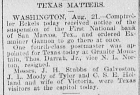 TEXAS MATTERS. I WASHINGTON, Aug. 21.-Comptroller Eckels today received notice of the suspension of the First National bank of San Marcos, Tex., and ordered Examiner Gannon to go there at once. One fourth-class postmaster was appointed for Texas today at Granite Mountain, Thos. Darrah, Jr., vice N. L. Norton, resigned. Messrs. J. H. Stubbs of Galveston, J. L. Moody of Tyler and C. S. E. Holland and wife of Victoria, were Texas visitors at the capitol today.