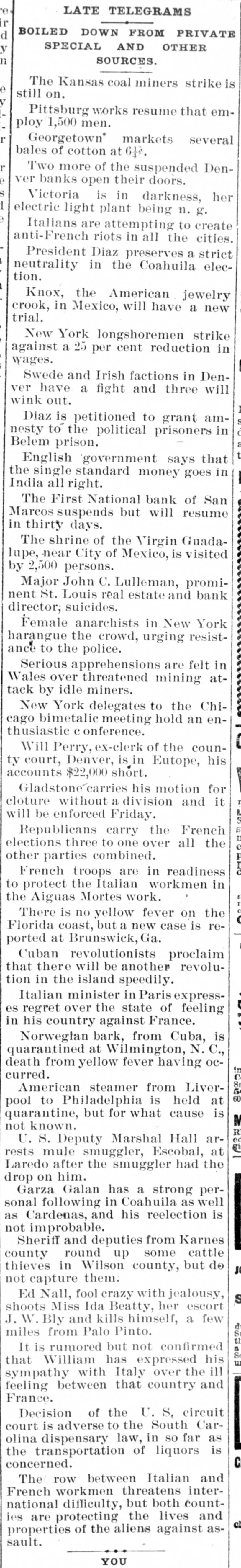 e LATE TELEGRAMS r BOILED DOWN FROM PRIVATE d SPECIAL AND OTHER n SOURCES. The Kansas coal miners strike is still on. Pittsburg works resume that employ 1,500 men. Georgetown markets several bales of cotton at 61. Two more of the suspended Denver banks open their doors. Victoria is in darkness, her electric light plant being n. g. Italians are attempting to create anti-French riots in all the cities. President Diaz preserves a strict neutrality in the Coahuila election. Knox, the American jewelry crook, in Mexico, will have a new trial. New York longshoremen strike against a 25 per cent reduction in wages. Swede and Irish factions in Denver have a fight and three will wink out. Diaz is petitioned to grant amnesty to the political prisoners in Belem prison. English government says that the single standard money goes in India all right. The First National bank of San Marcos suspends but will resume in thirty days. The shrine of the Virgin Guadalupe, near City of Mexico, is visited by 2,500 persons. Major John C. Lulleman, prominent St. Louis real estate and bank director; suicides. Female anarchists in New York harangue the crowd, urging resistance to the police. Serious apprehensions are felt in Wales over threatened mining attack by idle miners. New York delegates to the Chicago bimetalic meeting hold an enthusiastic c onference. Will Perry, ex-clerk of the county court, Denver, is in Eutope, his accounts $22,000 short. Gladstone'carries his motion for cloture without a division and it will be enforced Friday. Republicans carry the French elections three to one over all the other parties combined. French troops are in readiness to protect the Italian workmen in the Aiguas Mortes work. There is no yellow fever on the Florida coast, but a new case is reported at Brunswick, Ga. Cuban revolutionists proclaim that there will be another revolution in the island speedily. Italian minister in Paris expresses regret over the state of feeling in his country against France. Norwegtan bark, from Cuba, is quarantined at Wilmington, N. C., death from yellow fever having occurred. American steamer from Liver80% pool to Philadelphia is held at quarantine, but for what cause is not known. U. S. Deputy Marshal Hall arrests mule smuggler, Escobal, at Laredo after the smuggler had the drop on him. Garza Galan has a strong personal following in Coahuila as well as Cardenas, and his reelection is not improbable. Sheriff and deputies from Karnes county round up some cattle thieves in Wilson county, but do JO not capture them. Ed Nall, fool crazy with jealousy, S shoots Miss Ida Beatty, her escort J. W. Bly and kills himself, a few miles from Palo Pinto. It is rumored but not confirmed that William has expressed his sympathy with Italy over the ill feeling between that country and