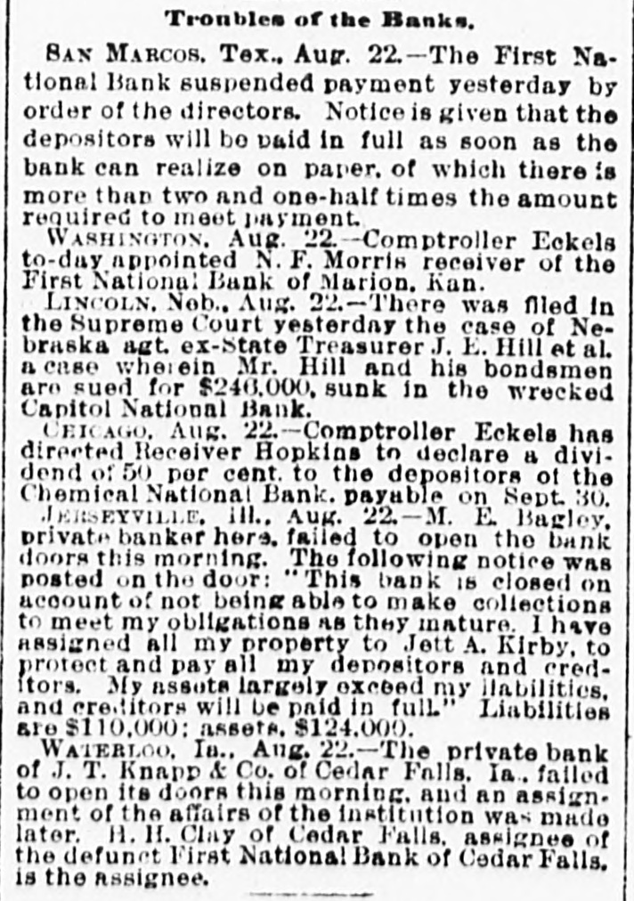 Tronbles of the Banks, SAN MARCOS. Tex., Aug. 22.-The First National Bank suspended payment yesterday by order of the directors. Notice is given that the depositors will be paid in full as soon as the bank can realize on paper. of which there is more than two and one-half times the amount required to meet payment. WASHINGTON, Aug. 22-Comptroller Eckels to-day appointed N. F. Morris receiver of the First National Bank of Marion. Kan. LINCOLN. Nob., Aug. 22.-There was filed in the Supreme Court yesterday the case of Nebraska agt. ex-State Treasurer J. E. Hill et al. a case wherein Mr. Hill and his bondsmen are sued for $246,000, sunk in the wrecked Capitol National Bank. CHICAGO, Aug. 22.-Comptroller Eckels has directed Receiver Hopkins to declare a dividend of 50 per cent. to the depositors of the Chemical National Bank. payable on Sept. 30. JERSEYVILLE, ill., Aug. 22.-M. E. Bagley. private banker here. failed to open the bank doors this morning. The following notice was posted on the door: This bank IS closed on account of not being able to make collections to meet my obligations AB they mature. I have assigned all my property to Jett A. Kirby, to protect and pay all my depositors and creditors. My assets largely exceed my llabilities, and creditors will be paid in full." Liabilities are $110,000: assets. $124,000. WATERLOO. Ia., Aug. 22.-The private bank of J. T. Knapp & Co. of Cedar Falls. Ia. failed to open its doors this morning. and an assignment of the affairs of the institution was made later. H. H. Clay of Cedar Falls. assignee of the defunct First National Bank of Cedar Falls. is the assignee.