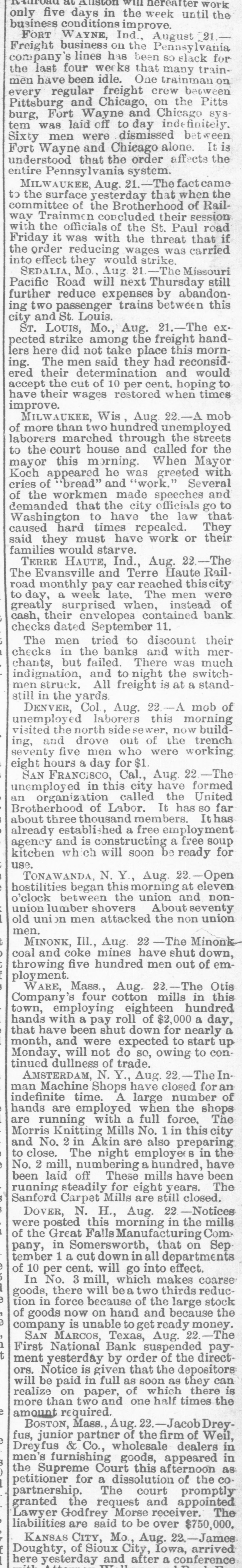 only five days in the week until the business conditions improve. FORT WAYNE, Ind., August Freight business on the Pennsylvania company's lines has been SO slack for the last four weeks that many trainmen have been idle. One trainman on every regular freight crew between Pittsburg and Chicago, on the Pitts burg, Fort Wayne and Chicago system was laid off to day finitely. Sixty men were dismissed between Fort Wayne and Chicago alone. It is understood that the order affects the entire Pennsylvania system. MILWAUKEE, Aug. factcame to the surface yesterday that when the committee of the Brotherhood of Railway Trainmen concluded their session with the officials of the St. Paul road Friday it was with the threat that if the order reducing wages was carried into effect they would strike. SEDALIA, Mo., Aug The Missouri Pacific Road will next Thursday still further reduce expenses by abandoning two passenger trains between this city and St. Louis. ST. LOUIS, Mo., Aug. 21.-The expected strike among the freight handlers here did not take place this morning. The men said they had reconsidered their determination and would accept the cut of 10 per cent. hoping to have their wages restored when times improve. MILWAUKEE, Wis, Aug. 22.-A mob of more than two hundred unemployed laborers marched through the streets to the court house and called for the mayor this morning. When Mayor Koch appeared he was greeted with cries of "bread" and "work." Several of the workmen made speeches and demanded that the city officials go to Washington to have the law that caused hard times repealed. They said they must have work or their families would starve. TERRE HAUTE, Ind., Aug. 22.-The The Evansville and Terre Haute Railroad monthly pay car reached thiscity to day, a week late. The men were greatly surprised when, instead of cash, their envelopes contained bank checks dated September 11. The men tried to discount their checks in the banks and with merchants, but failed. There was much indignation, and to night the switchmen struck. All freight is at a standstill in the yards. DENVER, Col., Aug. 22.-A mob of unemployed laborers this morning visited the north sidesewer, now building, and drove out of the trench seventy five men who were working eight hours a day for $1. SAN FRANCISCO, Cal., Aug 22 -The unemployed in this city have formed an organization called the United Brotherhood of Labor. It has so far about three thousand members. It has already established a free employment agency and is constructing a free soup kitchen wh ch will soon be ready for use. TONAWANDA, N. Y., Aug. 22.-Open hostilities began this morning at eleven o'clock between the union and nonunion lumber shovers About seventy old uni on men attacked the non union men. MINONK, Ill., Aug. 22 -The Minonkcoal and coke mines have shut down, throwing five hundred men out of employment. WARE, Mass, Aug. 22.-The - Otis Company's four cotton mills in this town, employing eighteen hundred hands with a pay roll of $2,000 a day, that have been shut down for nearly a month, and were expected to start up Monday, will not do so, owing to continued dullness of trade. AMSTERDAM, N. Y., Aug. 22. The Inman Machine Shops have closed for an indefinite time. A large number of hands are employed when the shops are running with a full force, The Morris Knitting Mills No. 1 in this city and No. 2 in Akin are also preparing to close. The night employee S in the No. 2 mill, numbering a hundred, have been laid off These mills have been running steadily for eight years. The Sanford Carpet Mills are still closed. DOVER, N. H., Aug. 22 -Notices were posted this morning in the mills of the Great Falls Manufacturing Company, in Somersworth, that on Sep tember 1 a cut down in all departments of 10 per cent. will go into effect. In No. 3 mill, which makes coarse goods, there will be a two thirds reduction in force because of the large stock of goods now on hand and because the company is unable to get ready money. SAN MARCOS, Texas, Aug. 22. -The First National Bank suspended payment yesterday by order of the directors. Notice is given that the depositors will be paid in full as soon as they can realize on paper, of which there is more than two and one half times the amount required. BOSTON, Mass., Aug. 22.-Jacob Dreyfus, junior partner of the firm of Weil, Dreyfus & Co., wholesale dealers in men's furnishing goods, appeared in the Supreme Court this afternoon as petitioner for a dissolution of the CO. partnership. The court promptly granted the request and appointed Lawyer Godfrey Morse receiver. The liabilities are said to be over $750,000. KANSAS CITY, Mo., Aug. 22.-James Doughty, of Sioux City, Iowa, arrived