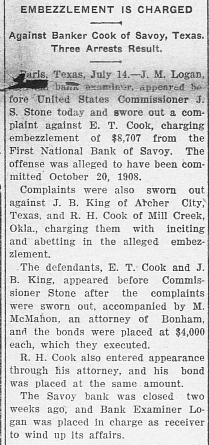 EMBEZZLEMENT IS CHARGED Against Banker Cook of Savoy, Texas. Three Arrests Result. Paris, Texas, July 14.-J. M. Logan, bank examiner, appeared be fore United States Commissioner J. S. Stone today and swore out a complaint against E. T. Cook, charging embezzlement of $8,707 from the First National Bank of Savoy. The offense was alleged to have been committed October 20, 1908. Complaints were also sworn out against J. B. King of Archer City, Texas, and R. H. Cook of Mill Creek, Okla., charging them with inciting and abetting in the alleged embezzlement. The defendants, E. T. Cook and J. B. King, appeared before Commissioner Stone after the complaints were sworn out, accompanied by M. McMahon, an attorney of Bonham, and the bonds were placed at $4,000 each, which they executed. R. H. Cook also entered appearance through his attorney, and his bond was placed at the same amount. The Savoy bank was closed two weeks ago, and Bank Examiner Logan was placed in charge as receiver to wind up its affairs.