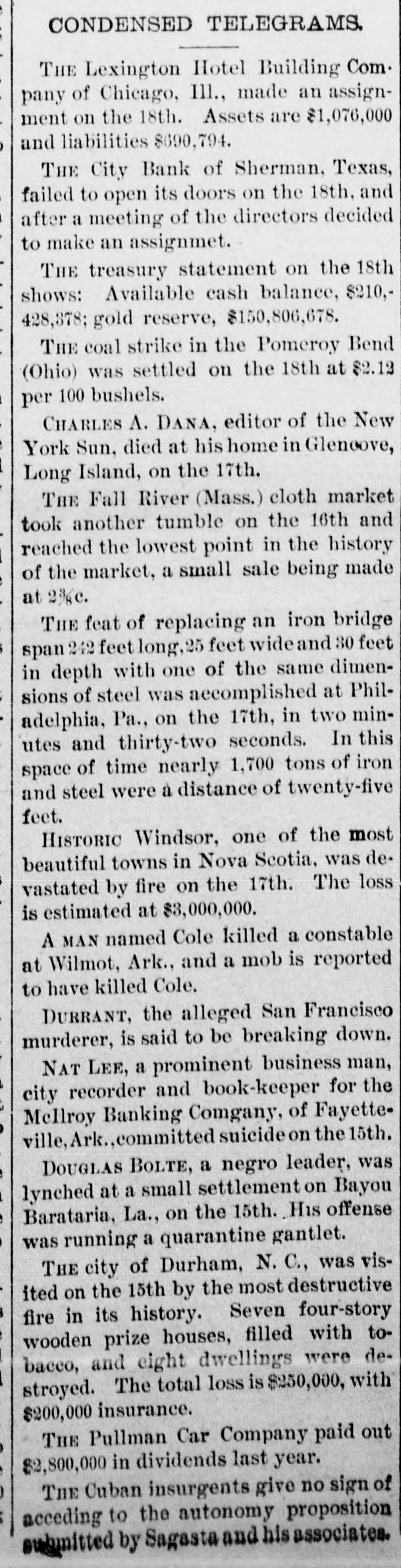 lawyer named Clark, lately an inmate O soldiers' home at Togus, Me., threw him self in front of an engine because he could not control the drinking habitCanvass of New York voters by The World shows a lead in preferences for the Tammany candidate for mayor of 40 per cent-Great Britain's cabinet decides to maintain the gold standard— Mrs. Langtry's husband is dead-General Booth of the Salvation Army is conducting a campaign in Germany-New York Republicans propose to fight the Seth Low petition on the ground that it bears fraudulent names—-Ezekiel Keefe to was bored death by a bull at Emden, Me-Benjamin Rich, member of football team, was killed during a game at Bellwood, Pa-Wellsboro, Pa., farmer, after winning $260 from bunco operators, drove them off at the point of a gunMail carrier at Charlottesville, Va., has received a check for $10,000 from a wealthy student at the University of Virginia-Nathaniel Mosely, slightly insane, killed G. H. Spencer near Great Barrington, Mass., in a quarrel over the murderer's mother-W. J. Bryan has given Ewing college at Berton, O., a sum of money for a scholarship because his mother was connected with the institution-Meeting to protest against New Orleans board of health on account of its management of yellow fever was a flasco—Lizzie Fleming, a domestic, mentally unbalanced, fractured the skulls of A. C. Dixon and wife at Stamford, Conn., and slightly wounded their daughter with an ax, during a sudden attack of murderous mania-Investigation showed that the falling of the dome in the theater at Cincinnati was due to a rotten framework that had been covered by ornamental plastering-Oklahoma has 300,000 population. TUESDAY, OCT. 19. Scaffold holding 10 men gave way at Watessing, N. J., and the occupants dropped upon electric machinery in motion, only three being seriously hurt -Decomposed body of M. J. Scanlan, Boston liquor dealer, was found in a grove at Murray River, N. S-Insurance on destroyed property at Windsor, N. S., is estimated to approximate $582,000, less than a third of the actual loss sustained by the conflagration-A timber firm near Austin, Pa., lost $200,000 by forest fires—Dr. Bessey, a leading physician of Toronto, was arrested on a charge of causing a widow's death by abortion-A child died after drinking carbolic acid at Fitchburg, Mass., and two other little ones were badly burned while playing with matches— Five members of the Labe family at Waterville, Me., and a visitor were made ill by canned salmon, two of the eaters being in a critical condition-A thousand rifles and 500,000 cartridges were seized on a schooner near Panama, the munitions being designed for use in a revolution at Nicaragua-It is proposed to build a tunnel under the East river to connect Brooklyn and Jersey City-The City bank of Sherman, Tex., has assigned. with liabilities of $50,000 and assets of $200,000-Yale college is to be sued by the town of New Haven for a large amount of taxes-Lord Salisbury is not to resign the British premiership, it is stated officially-The grave of a colored man named Bennett was opened at Millburn, N. J., and upper part of the body carried away-George Clark was held up by highwaymen and robbed of $17 Woburn, Mass-The worsted operatives in Rhode Island are to have their wages advanced-F. E. Argerer, bookkeeper for the Lilly Brackett company, is accused of taking $900 of the corporation's money-Arthur Bourassa of Fall River, Mass., 18 years old, was drowned by the capsizing of a boat-Two alleged incendiaries were lynched at Somerville, Ga-It is reported in Washington that Thomas F. Bayard will become the eastern representative of London capitalists at a salary equal to that of the president of the United States. WEDNESDAY, OCT. 20. Woman's suffrage was defeated in New Jersey by a majority of 10,059, while the voters approved of the antigambling act-Factory of the Bethel (Conn.) Hat Forming company, valued
