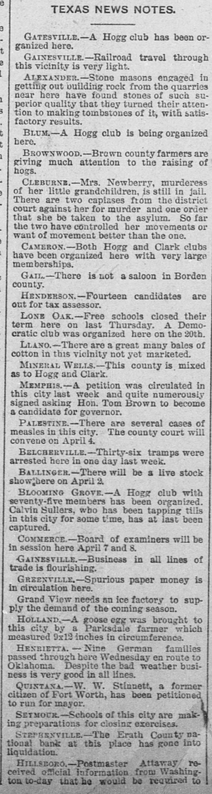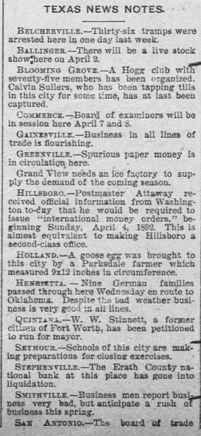 TEXAS NEWS NOTES. BELCHERVILLE.-Thirty-six tramps were arrested here in one day last week. BALLINGER.-There will be a live stock show:here on April 2. BLOOMING GROVE.-A Hogg club with seventy-five members has been organized. Calvin Sullers, who has been tapping tills in this city for some time, has at last been captured. COMMERCE.-Board of examiners will be in session here April 7 and 8. GAINESVILLE.-Busines in all lines of trade is flourishing. GREENVILLE.-Spurous paper money is in circulation here. Grand View needs an ice factory to supply the demand of the coming season. HILLSBORO.-Postmaster Attaway received official information from Washington to-day that he would be required to issue "international money orders." beginning Sunday, April 4, 1892. This is almost equivalent to making Hillsboro a second-class office. HOLLAND.-A goose egg was brought to this city by a Parksdale farmer which measured 9x12 inches in circumference. HENRIETTA. - Nine German families passed through here Wednesday en route to Oklahoma. Despite the bad weather business is very good in all lines. QUINTANA.-W. W. Stinnett, a former citizen of Fort Worth, has been petitioned to run for mayor. SEYMOUR.-Schools of this city are making preparations for closing exercises. STEPHENVILLE.-The Erath County national bank at this place has gone into liquidation. SMITHVILLE.-Business men report business very bad, but anticipate a rush of business this spring. SAN ANTONIO.-The board of trade