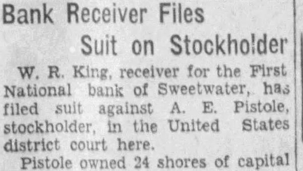 Bank Receiver Files Suit on Stockholder W. R King, receiver for the First National bank of Sweetwater, has filed suit against A. E. Pistole, stockholder in the United States district court here. Pistole owned 24 shores of capital