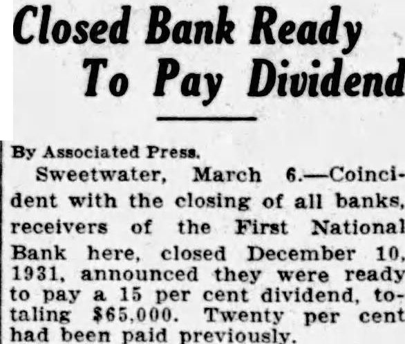 Closed Bank Ready To Pay Dividend By Associated Press Sweetwater, March 6.-Coincident with the closing of all banks, receivers of the First National Bank here, December 1931. announced they were ready pay cent dividend, totaling Twenty per cent had been paid previously.