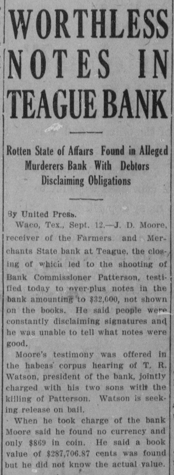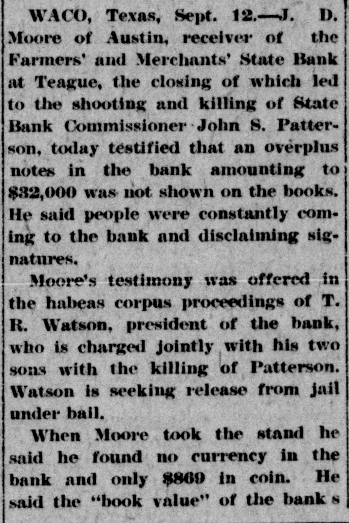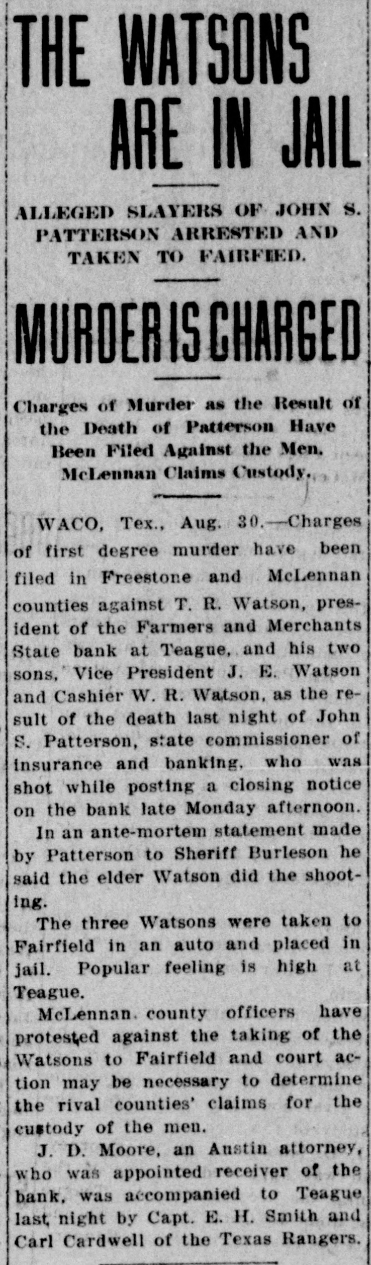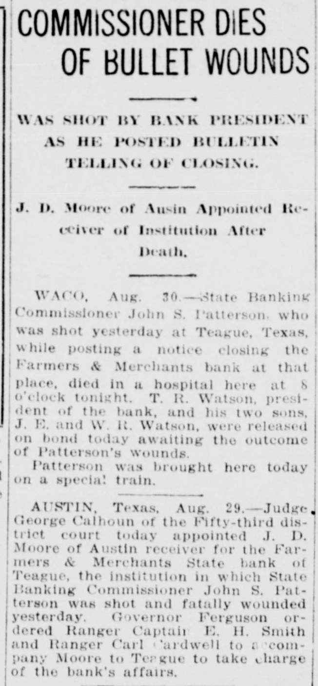 STATE OFFICIAL SHOT Commiasioner of Banking Probably Fatally Wounded While Posting Notice of Bank's Failure. TEAGUE, TEX., August 28.-John S. Patterson, State commissioner of insurance and banking. was shot and probably fatally wounded late to-day in the lobby of the Farmers' and Merchants' Bank here when, it was said. he attempted to post a notice announcing that the bank had been closed. Three shots also were fired at J. E. McKinnon State bank examiner, but none of the bullets took effect. T. R. Watson. president of the bank. and his two sons, J. E. Watson, vicepresident and W. R. Watson, cashier, were arrested in connection with the shooting and charged with assault to murder.