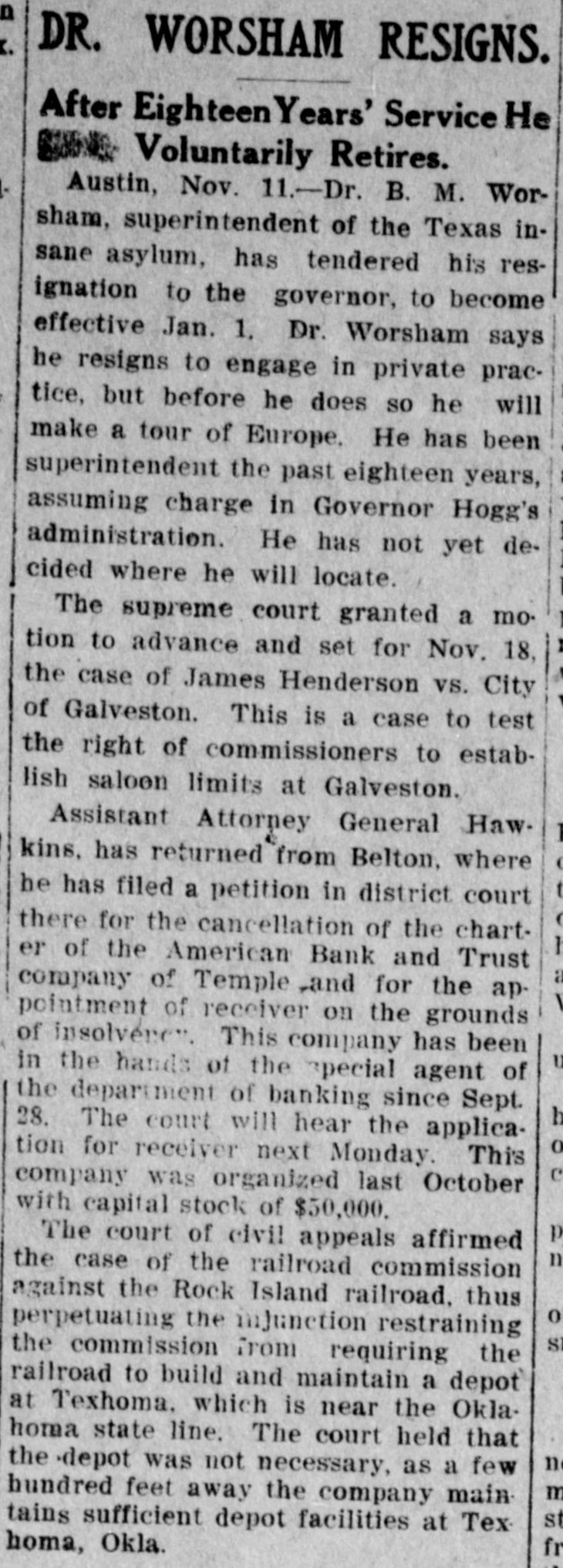 BANK STOPS BUSINESS. Arrangements Made to Pay All Its Obligations. Austin, Sept. 30.-The American Bank and Trust company of Temple has closed its doors and gone into voluntary liquidation, according to a tele gram received from John J. Cox, pres Ident of the institution, by Commis sioner of Banking Love. President Cox wires that he has placed the affairs of the bank in the hands of State Bank Examiner Dezavalla. The bank was organized last fall with $50,000 capital. Its deposits Tuesday amounted to $4,000. Arrangements were made before the bank closed to pay all depositors in full through a Temple bank. The failure is said to be largely due to the opening for business during the panic last fall. Confederate pensioners will only get $15 per quarter for next two quarters, according to the apportionment just made by the Comptroller of $250,000 to pay pensions for the next six months This is a decrease of $1 for each quarter from two previous quarters. The decrease is due to the increase in the number of pensions, which are now nearly 9,000. The Worthington-Green Lumber company of Dallas filed an amendment to its charter, changing its name of the corporation to the Duncan-Green Lumber company.