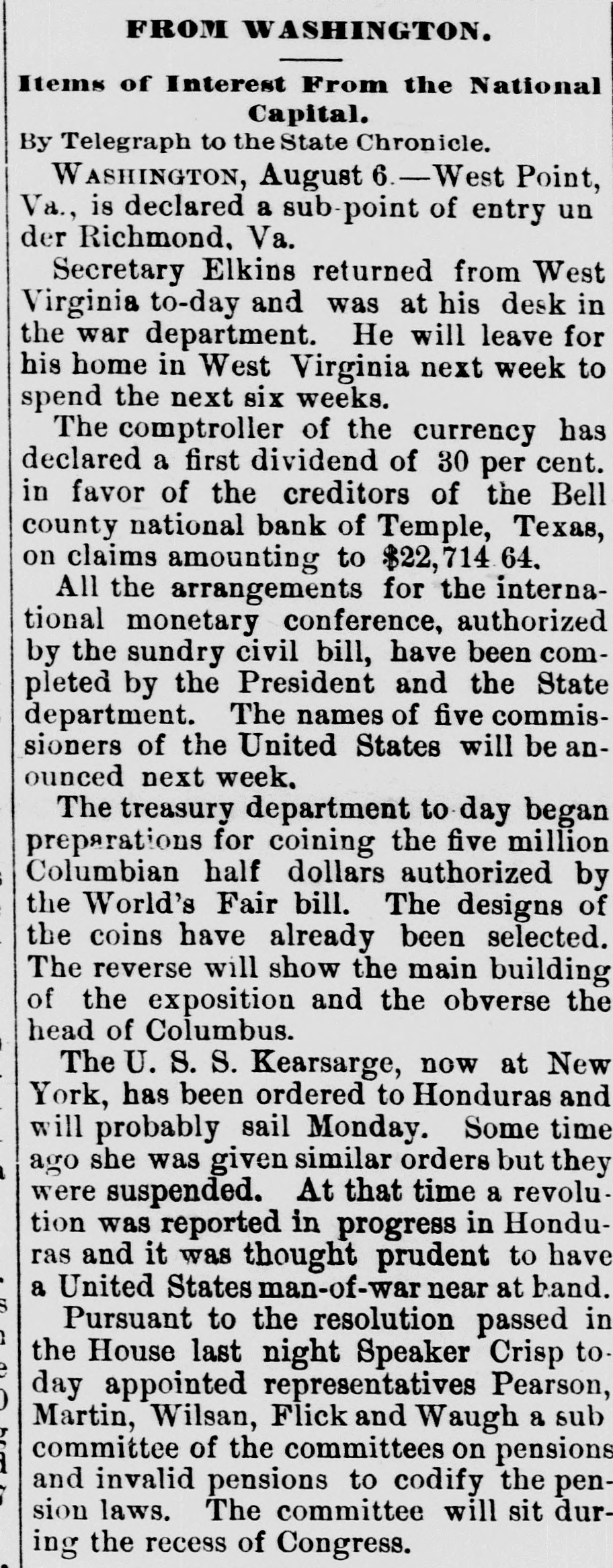 FROM WASHINGTON. Items of Interest From the National Capital. By Telegraph to the State Chronicle. WASHINGTON, August - West Point, Va., is declared a sub-point of entry un der Richmond, Va. Secretary Elkins returned from West Virginia to-day and was at his desk in the war department. He will leave for his home in West Virginia next week to spend the next six weeks. The comptroller of the currency has declared a first dividend of 30 per cent. in favor of the creditors of the Bell county national bank of Temple, Texas, on claims amounting to $22,714.64. All the arrangements for the international monetary conference, authorized by the sundry civil bill, have been completed by the President and the State department. The names of five commissioners of the United States will be anounced next week. The treasury department to day began preparations for coining the five million Columbian half dollars authorized by the World's Fair bill. The designs of the coins have already been selected. The reverse will show the main building of the exposition and the obverse the head of Columbus. The U. S. S. Kearsarge, now at New York, has been ordered to Honduras and will probably sail Monday. Some time ago she was given similar orders but they were suspended. At that time a revolution was reported in progress in Honduras and it was thought prudent to have a United States man-of-war near at band. Pursuant to the resolution passed in the House last night Speaker Crisp to day appointed representatives Pearson, Martin, Wilsan, Flick and Waugh a sub committee of the committees on pensions and invalid pensions to codify the pension laws. The committee will sit during the recess of Congress.