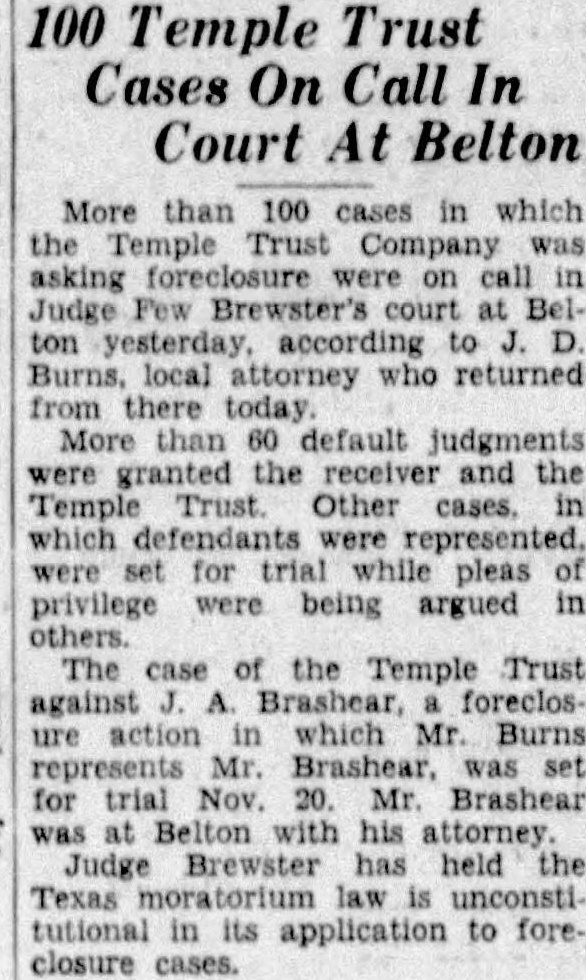 100 Temple Trust Cases On Call In Court At Belton More than 100 cases in which the Temple Trust Company was asking foreclosure were on call Judge Few court at ton according Burns, local attorney who returned from there today More than 60 default judgments were granted the receiver and the Temple Trust Other which were represented. for trial while pleas privilege were being argued others. The case of the Temple Trust against Brashear, ure action which Mr Burns Mr. was set for trial Nov. Mr. Brashear at Belton with his attorney Judge Brewster has held the Texas law tutional in its application to fore. closure cases.