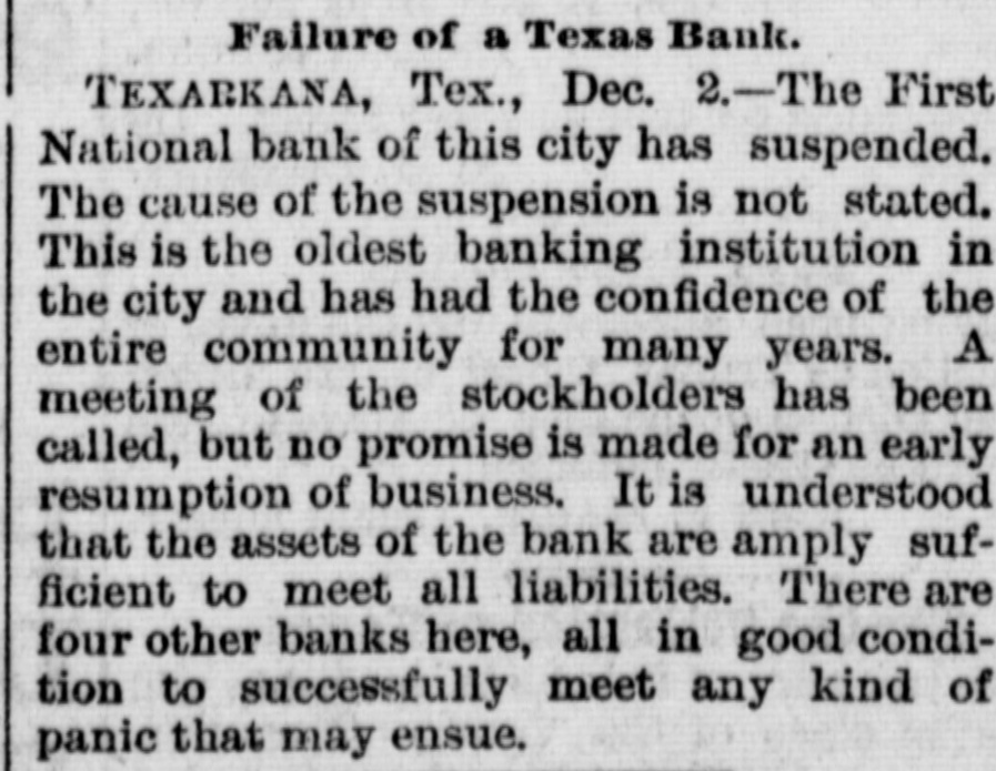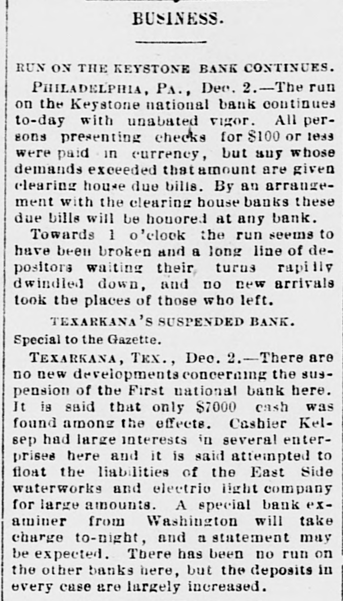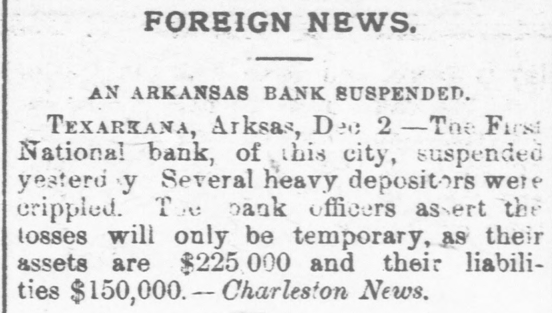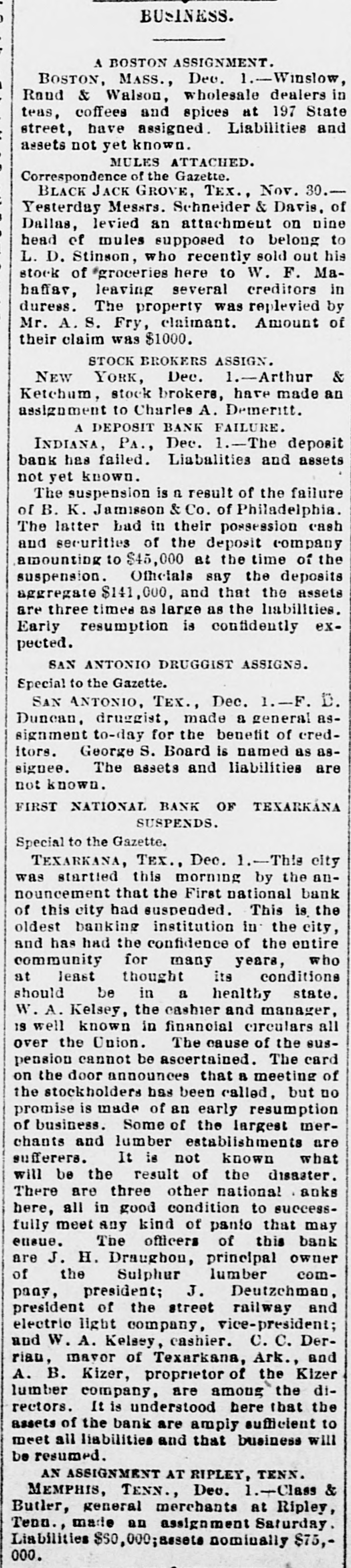 BUSINESS FAILURES. Assignment of a Boston Wholesale Firm. Suspension of Banks. NEW YORK, Dec. 1.-Arthur & Ketchum, stock-brokers, have assigned. BOSTON, Dec. 1.-Winslow, Reed & Watson, wholesale dealers in teas, coffees and spices, have assigned. Winslow says the immediate cause of the failure is stringency in the money market. He has no idea of the amount of liabilities and assets. PITTSBURG, Dec. 1.-An Indiana (Pa,) special says the Deposit Bank has failed. The liabilities and assets are unknown. The closing of the doors of the Deposit Company is the result of the failure of B. K. Jamison & Co., Philadelphia. The latter had in their possession cash and securities of the Deposit Company amounting to $45,000 at the time of the suspension. The officials say the deposits aggregate $141,000, and the assets are three times as large. An early resumption is expected. The chief stockholder, White, spent some time in Philadelphia, trying to recover securities or money from the Jamisons, but was unable to do so. He stated to-day that the bank is solvent and will pay dollar for dollar, and all they wanted was time enough to turn the securities into money. The principal depositors express confidence in the bank. TEXARKANA (Ark.), Dec. 1.-The First National Bank suspended this morning. The bank officials assert that the embarassment will be only temporary, as their assets are $255,000 and liabilities $150,000. GUTHRIE (Ind. T.), Dec. 1.-President Ragsdale of the Commercial National Bank, which suspended last week, has been arrested under an indictment charging him with a violation of the banking laws.