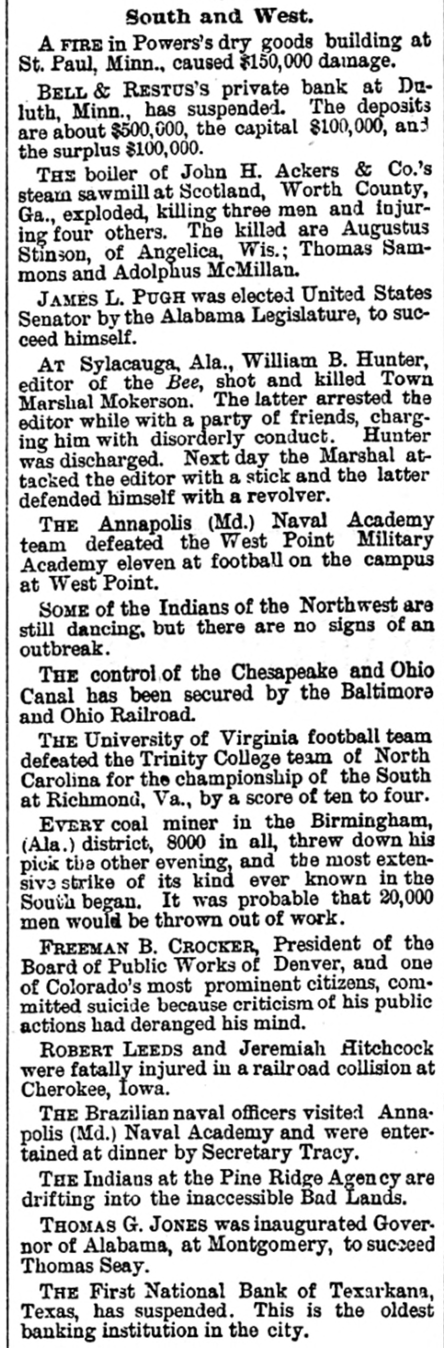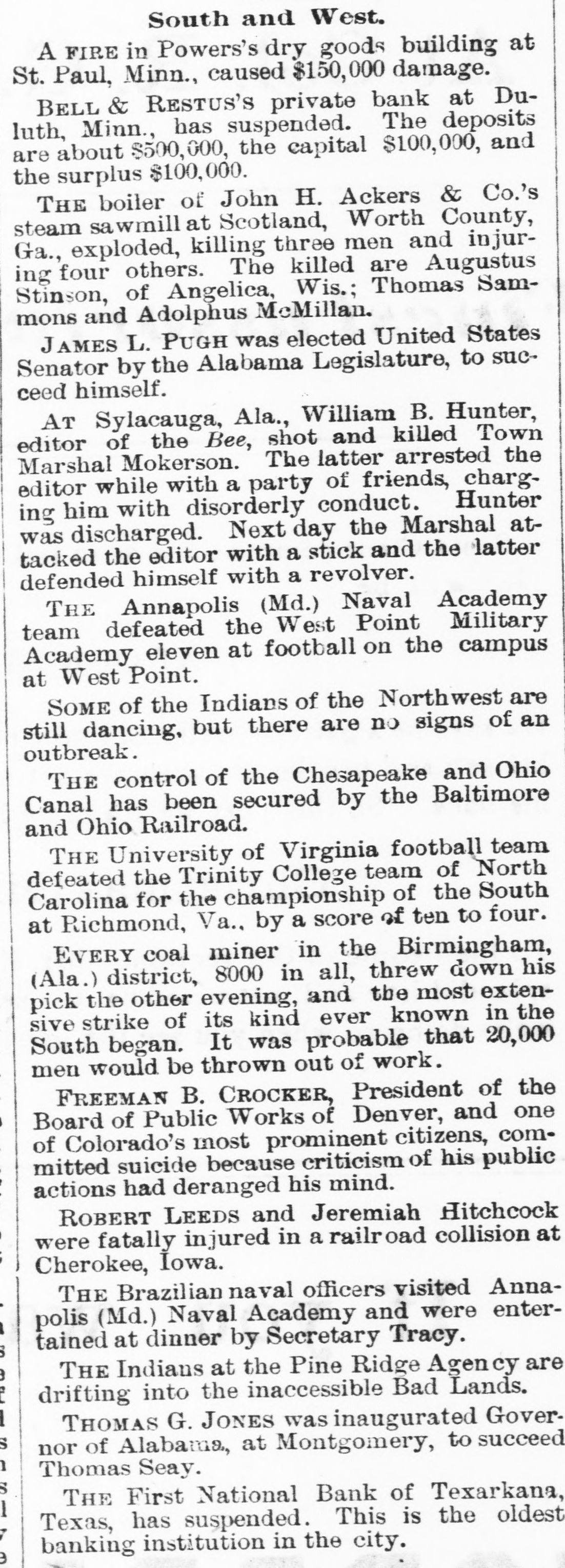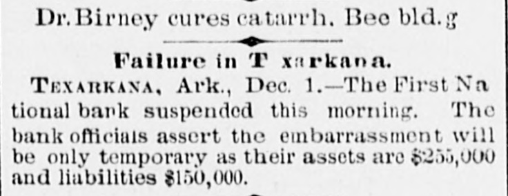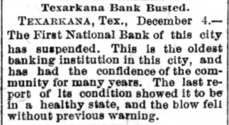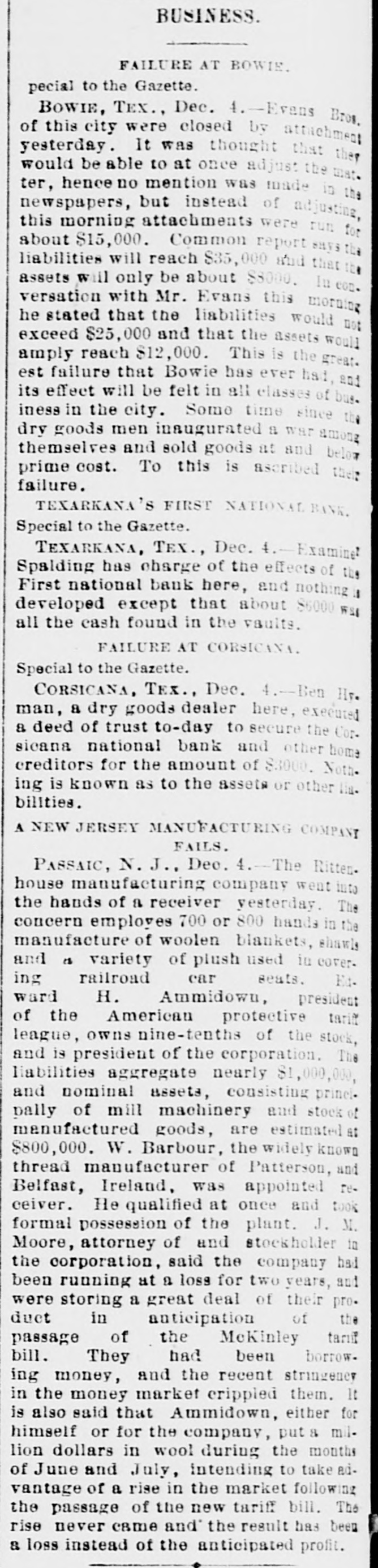 BUSINESS FAILURES. Assignment of a Boston Wholesale Firm. Suspension of Banks. NEW YORK, Dec. 1.-Arthur & Ketchum, stock-brokers, have assigned. BOSTON, Dec. 1.-Winslow, Reed & Watson, wholesale dealers in teas, coffees and spices, have assigned. Winslow says the immediate cause of the failure is stringency in the money market. He has no idea of the amount of liabilities and assets. PITTSBURG, Dec. 1.-An Indiana (Pa,) special says the Deposit Bank has failed. The liabilities and assets are unknown. The closing of the doors of the Deposit Company is the result of the failure of B. K. Jamison & Co., Philadelphia. The latter had in their possession cash and securities of the Deposit Company amounting to $45,000 at the time of the suspension. The officials say the deposits aggregate $141,000, and the assets are three times as large. An early resumption is expected. The chief stockholder, White, spent some time in Philadelphia, trying to recover securities or money from the Jamisons, but was unable to do so. He stated to-day that the bank is solvent and will pay dollar for dollar, and all they wanted was time enough to turn the securities into money. The principal depositors express confidence in the bank. TEXARKANA (Ark.), Dec. 1.-The First National Bank suspended this morning. The bank officials assert that the embarassment will be only temporary, as their assets are $255,000 and liabilities $150,000. GUTHRIE (Ind. T.), Dec. 1.-President Ragsdale of the Commercial National Bank, which suspended last week, has been arrested under an indictment charging him with a violation of the banking laws.