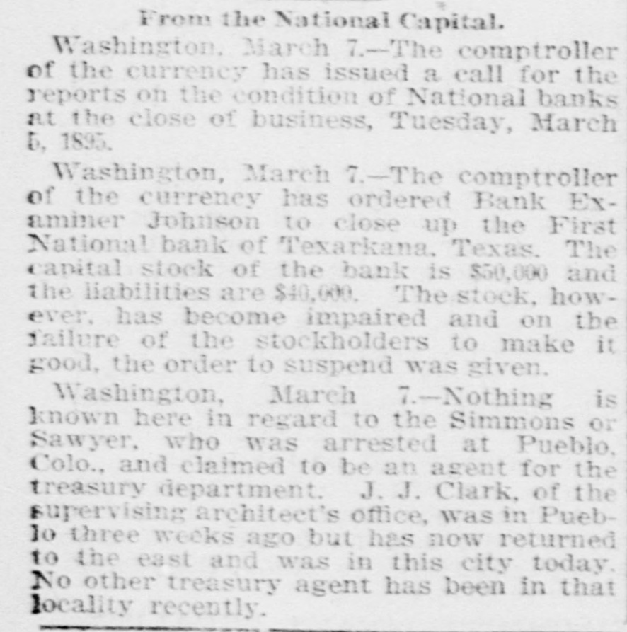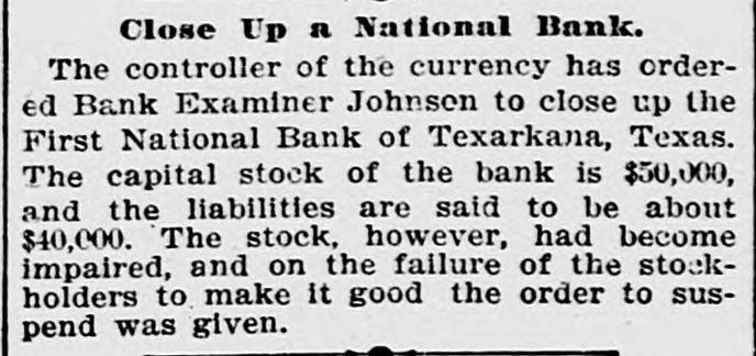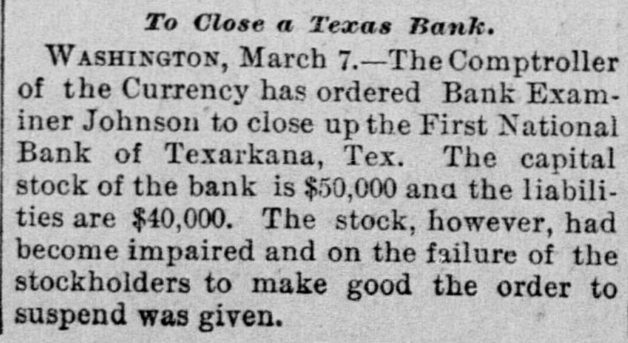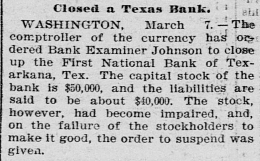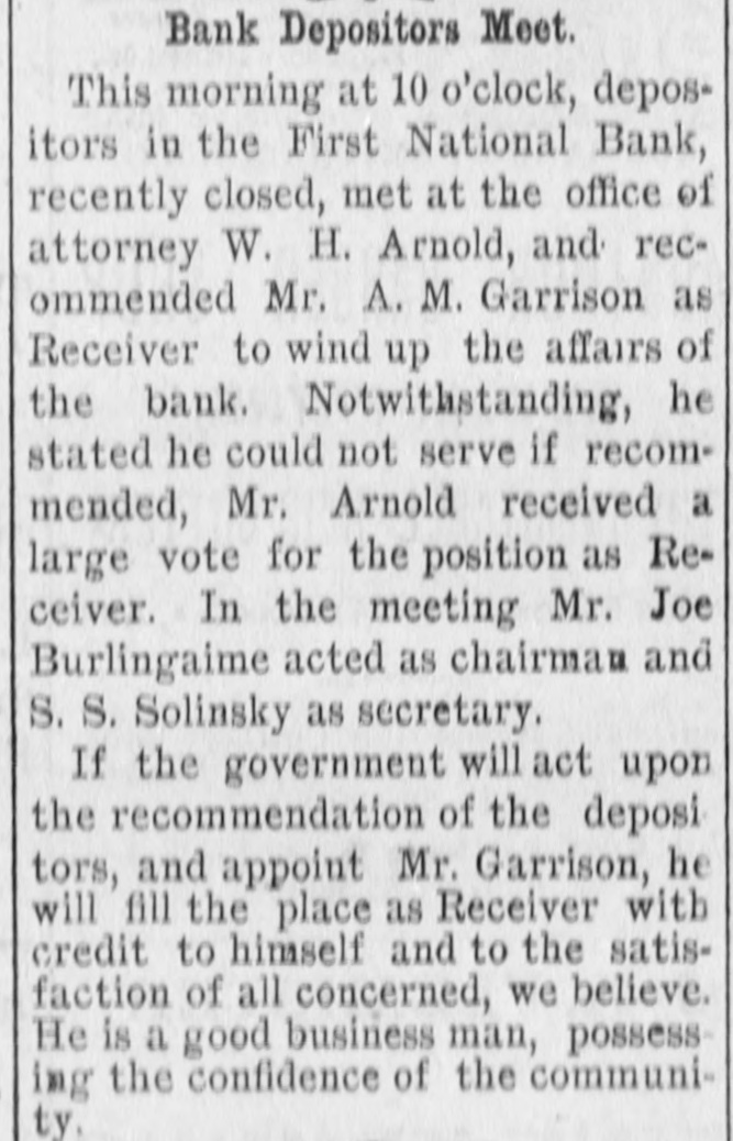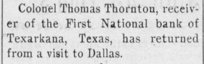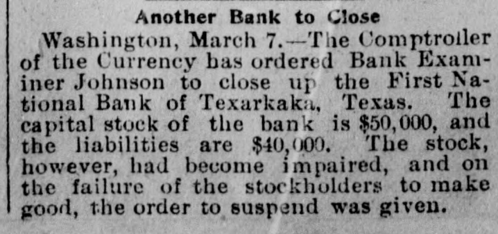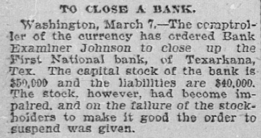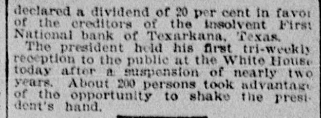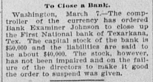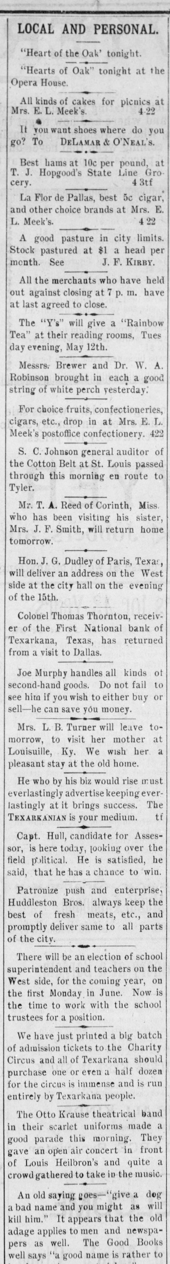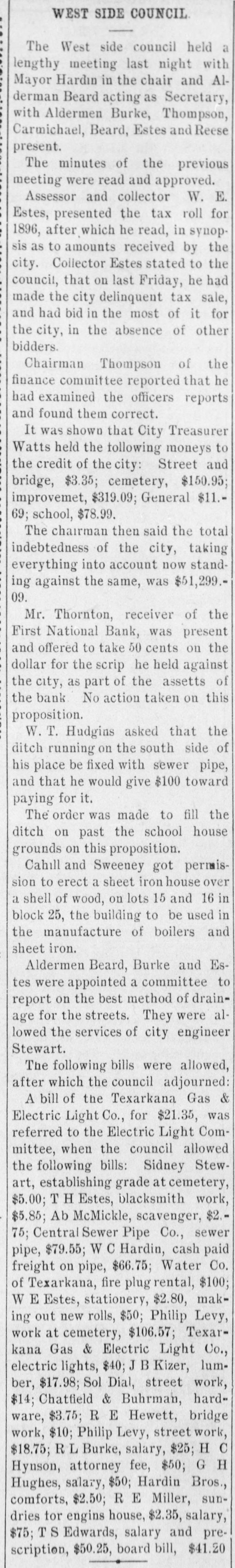 WEST SIDE COUNCIL The West side council held a lengthy meeting last night with Mayor Hardin in the chair and Alderman Beard acting as Secretary, with Aldermen Burke, Thompson, Carmichael, Beard, Estes and Reese present. The minutes of the previous meeting were read and approved. Assessor and collector W. E. Estes, presented the tax roll for 1896, after which he read, in synopsis as to amounts received by the city. Collector Estes stated to the council, that on last Friday, he had made the city delinquent tax sale, and had bid in the most of it for the city, in the absence of other bidders. Chairman Thompson of the finance committee reported that he had examined the officers reports and found them correct. It was shown that City Treasurer Watts held the following moneys to the credit of the city: Street and bridge, $3.35; cemetery, $150.95; improvemet, $319.09; General $11.69; school, $78.99. The chairman then said the total indebtedness of the city, taking everything into account now standing against the same, was $51,299.09. Mr. Thornton, receiver of the First National Bank, was present and offered to take 50 cents on the dollar for the scrip he held against the city, as part of the assetts of the bank No action taken on this proposition. W. T. Hudgins asked that the ditch running on the south side of his place be fixed with sewer pipe, and that he would give $100 toward paying for it. The order was made to fill the ditch on past the school house grounds on this proposition. Cahill and Sweeney got permission to erect a sheet iron house over a shell of wood, on lots 15 and 16 in block 25, the building to be used in the manufacture of boilers and sheet iron. Aldermen Beard, Burke and Estes were appointed a committee to report on the best method of drainage for the streets. They were allowed the services of city engineer Stewart. The following bills were allowed, after which the council adjourned: A bill of the Texarkana Gas & Electric Light Co., for $21.35, was referred to the Electric Light Committee, when the council allowed the following bills: Sidney Stewart, establishing grade at cemetery, $5.00; T H Estes, blacksmith work, Ab McMickle, scavenger, $2.$5.85; Co., 75; Central Sewer Pipe sewer pipe, $79.55; W C Hardin, cash paid freight on pipe, $66.75; Water Co. of Texarkana, fire plug rental, $100; W E Estes, stationery, $2.80, making out new rolls, $50; Philip Levy, work at cemetery, $106.57; Texarkana Gas & Electric Light Co., electric lights, $40; J B Kizer, lumber, $17.98; Sol Dial, street work, $14; Chatfield & Buhrman, hardware, $3.75; R E Hewett, bridge work, $10; Philip Levy, street work, C $18.75; RL Burke, salary, $25; H Hynson, attorney fee, $50; G H Hughes, salary, $50; Hardin Bros., comforts, $2.50; R E Miller, sundries for engins house, $2.35, salary, $75; TS Edwards, salary and prescription, $50.25, board bill, $41.20