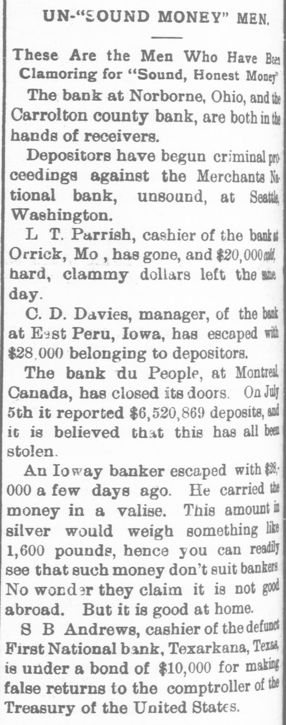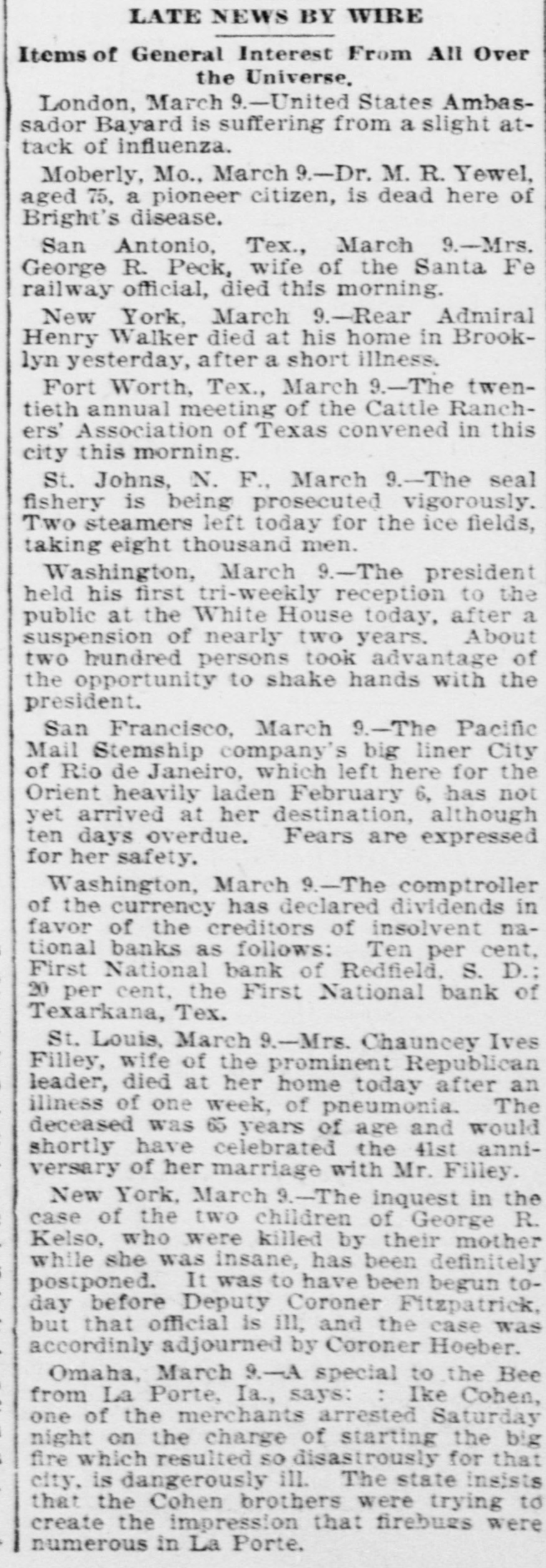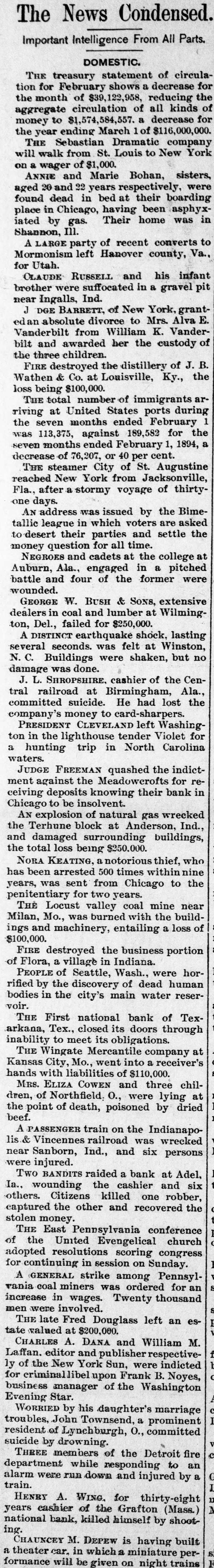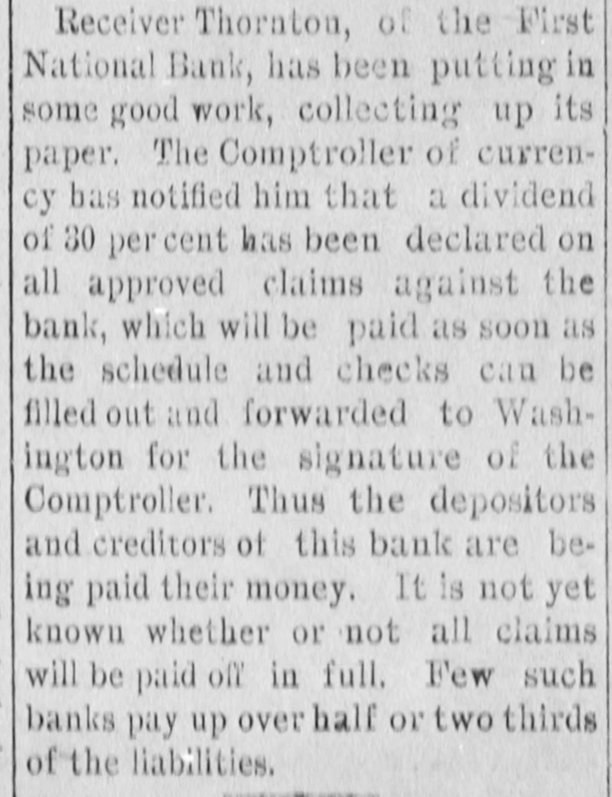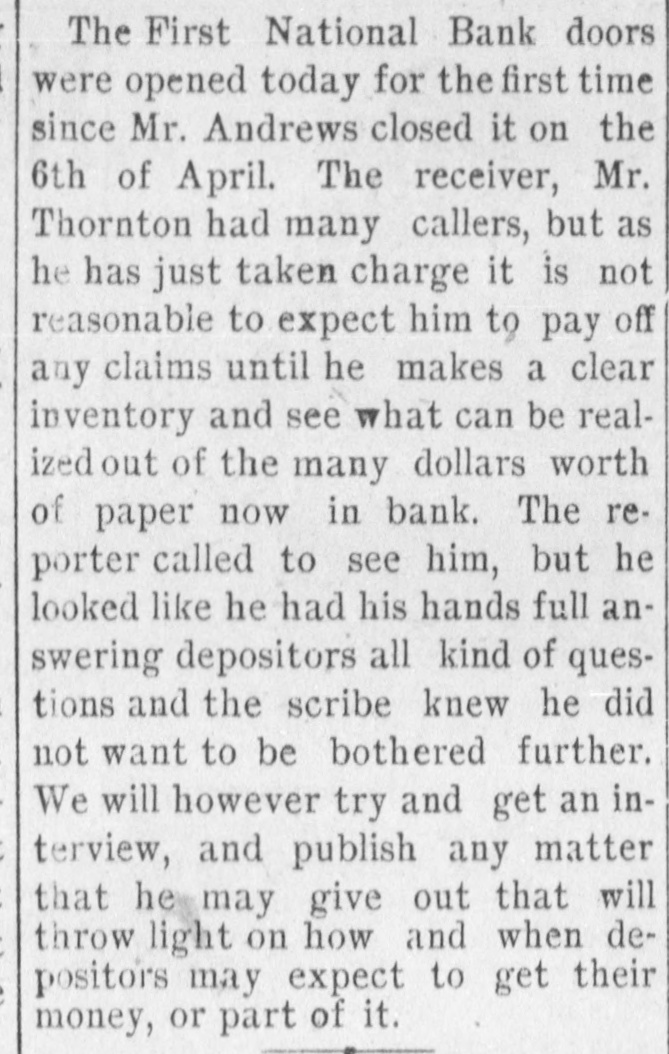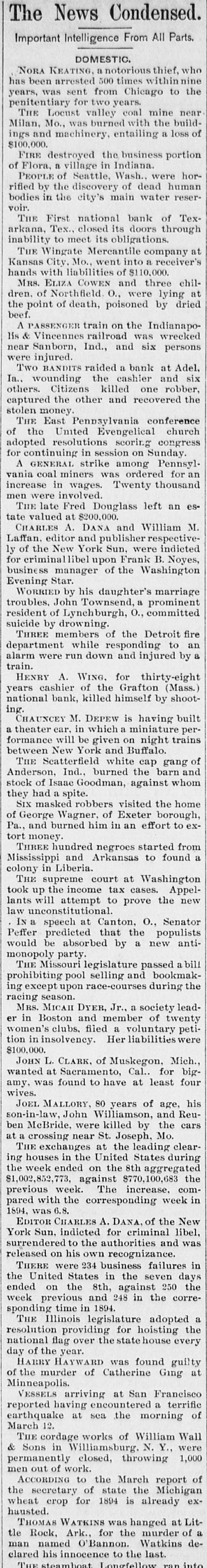 WEST SIDE COUNCIL The West side council held a lengthy meeting last night with Mayor Hardin in the chair and Alderman Beard acting as Secretary, with Aldermen Burke, Thompson, Carmichael, Beard, Estes and Reese present. The minutes of the previous meeting were read and approved. Assessor and collector W. E. Estes, presented the tax roll for 1896, after which he read, in synopsis as to amounts received by the city. Collector Estes stated to the council, that on last Friday, he had made the city delinquent tax sale, and had bid in the most of it for the city, in the absence of other bidders. Chairman Thompson of the finance committee reported that he had examined the officers reports and found them correct. It was shown that City Treasurer Watts held the following moneys to the credit of the city: Street and bridge, $3.35; cemetery, $150.95; improvemet, $319.09; General $11.69; school, $78.99. The chairman then said the total indebtedness of the city, taking everything into account now standing against the same, was $51,299.09. Mr. Thornton, receiver of the First National Bank, was present and offered to take 50 cents on the dollar for the scrip he held against the city, as part of the assetts of the bank No action taken on this proposition. W. T. Hudgins asked that the ditch running on the south side of his place be fixed with sewer pipe, and that he would give $100 toward paying for it. The order was made to fill the ditch on past the school house grounds on this proposition. Cahill and Sweeney got permission to erect a sheet iron house over a shell of wood, on lots 15 and 16 in block 25, the building to be used in the manufacture of boilers and sheet iron. Aldermen Beard, Burke and Estes were appointed a committee to report on the best method of drainage for the streets. They were allowed the services of city engineer Stewart. The following bills were allowed, after which the council adjourned: A bill of the Texarkana Gas & Electric Light Co., for $21.35, was referred to the Electric Light Committee, when the council allowed the following bills: Sidney Stewart, establishing grade at cemetery, $5.00; T H Estes, blacksmith work, Ab McMickle, scavenger, $2.$5.85; Co., 75; Central Sewer Pipe sewer pipe, $79.55; W C Hardin, cash paid freight on pipe, $66.75; Water Co. of Texarkana, fire plug rental, $100; W E Estes, stationery, $2.80, making out new rolls, $50; Philip Levy, work at cemetery, $106.57; Texarkana Gas & Electric Light Co., electric lights, $40; J B Kizer, lumber, $17.98; Sol Dial, street work, $14; Chatfield & Buhrman, hardware, $3.75; R E Hewett, bridge work, $10; Philip Levy, street work, C $18.75; RL Burke, salary, $25; H Hynson, attorney fee, $50; G H Hughes, salary, $50; Hardin Bros., comforts, $2.50; R E Miller, sundries for engins house, $2.35, salary, $75; TS Edwards, salary and prescription, $50.25, board bill, $41.20