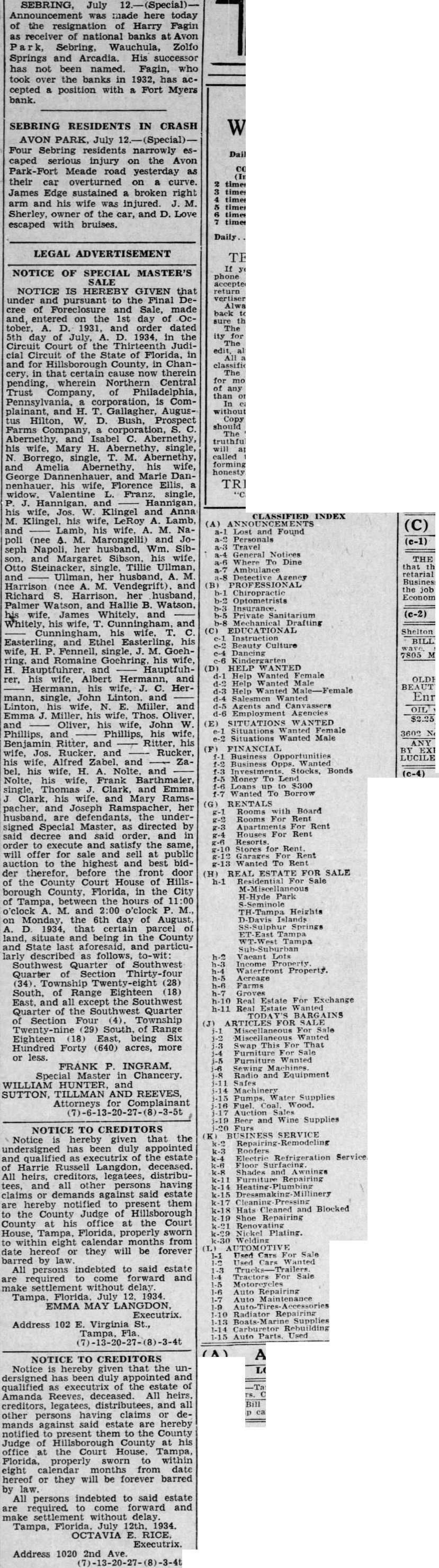 FLORIDA LETTER WRITTEN BY C. WOLF Sebring, Feb. This Sunday evening. February The Ephrata tourists, who 10th. Florida with Mark Hibshcame man's party, all went to the Brethren church this morning Rev. Miller, had minister was in the pulthe regular and preached good sermon before full house. was very warm in the church, and noticed quite few who were bowing their heads though in silent prayer, but later they were sleeping Well hard to keep awake when one very sleepy; know by my but think must rather hard for the preacher talk sleepx audience. This afternoon temperature was 88 and it was Mr. Hibshman suggest pretty not. that we take trip around the lake, and most of us were agreed In the evening we went to church again, and heard Rev. Dove. of Vir ginfia, preach wonderful sermon plain that all could understand He has congregation of over 400 members in Virginia. There were some tourists church tonight. At P. M., the was up to 76. temperature Monday evening, Feb. 11th. This morning saw the first real excite bought ment here in Sebring since the boom year; the Highland Bank and Trust Company failed to open its doors, and had short time many people were gathered in front of the Bank. Some women were crying, and many othwere complaining of having their all in this Bank. One man just came out of the Hospital on Saturday and was going to his home Georgia today. He expected to draw his money out of the Bank this morn. ing, which was $600.00. He said that all he has now is 13 cents. Our bakwho near us, cried when learned that the Bank had failed, was had all his money in it, and was at building new bakery. He can't ahead with now. Many other sorrowful stories were told by per sons who said they had all their ey in this Bank, and now have noth ing to live As the news of the bridge closing of this Bank spread, many people that had their money in the tempt First National Bank got alarmed and made run on that bank, which lastand until after noon time, with crowds excited people crowded into the Bank to draw their money. Some the Bank officials tried to tell the Mrs. people that there was no danger Mrs. Bank closing, as they didn't owe dollar, that the institution was in good standing, and would have money to pay all who wanted their money. them refuse to pay large checks, but told these people to later. The run on this Bank come let up when half-dozen Sebring all, business men and capitalists bought soup up all Bank Stock held by non-resibut dents, and at the close of the Bank, 3:00 o'clock, the Bank, Mr. Bobb, said that the deposits of the day totaled more than caught withdrawals. The closed Highland Bank was organized ten years ago, and was capitalized at $150,000 Gharst is President. Mr. man Gharst's popularity, and he was minister of the Brethren when Church, was responsible for so many plain and other people having their deposits in this Bank and happen to be one them. Tuesday Feb. This morning the Mark bus and party left Sebring, for home, going by way of Silver Spring. Here they expected to take trip in the glassbottomed boat. We were SOFFY to see them leave and will surely seem lonesome for while. The report today that there much snow thru Virginia, SO that might cause them some trouble traveling but said, 'Leave to Mark; he will pilot them through safely. This morning ated went to the Farmers Market and found six farmers there with lots all kinds of greens and party Later saw they had more of supply than was needed for this market. Maybe the closing of the Bank had something to do with This being Lincoln's birthday, went to see whether the First National open, and it was, and was doing before the run but when got to the Highland Bank found notice on the door. This Bank in the hands of the State Controller. also saw groups of people, at many places, talking about the hardship many people as result of the Bank's closing. found out today that certain had advised all his friends to draw their money out of the Bank, as it wasn't this accounts for the notice on the door yesterday stating that the closing of the Bank was caused by silent run that had been going on during the last few weeks, and surely Bank could stand for all the withdrawal of money, but believe they have too many in estate as result of the boom of few ago, which that time but are elephants on their hands. We will wait and Mayor William King, aged 72, City Controller A. Crews, 35, both Avon Park, were killed at the Main street crossing, near the depot, at Avon Park, by the Orange Blossom Special of the Seaboard Railroad. Their auto demolished ing Mayor King at the wheel, and must not have seen the northbound flyer King was one of the founders of Avon Park, about years ing, Wednesday evening, Feb. 13. This morning Mr. and Mrs. Daniel Keller called our house, to take us along all on fishing trip Mr. and Mrs. Langner and his brother-inand wife also went along in their machine. arrived at Morehaven at 8:00 o'clock, and fished until noon, but luck against only caught two, and Mr. Keller one, all channel catfish, and not large young lad was fishing close to where was, and caught fine 10-pound channel catfish. bought from him for fifty cents, and was good thing that bought it. because only caught more. On the home road, dinner, we went to Lakeport, 13 miles north of Morehaven, and here they said there good fishing out toward Brighton. was nice drive along the lake, distance of 14 miles to the canal. Here we fished while, and Mr. Keller, who was fishing with fine artificial bait that he had just bought for this trip, hooked large mud black fish; in trying to land it, he tore line, and lost the fish and also the then fished artificial with hook and line for catfish, and got three a very of one, this the catch for the with the one bought we had enough for trip. for by way of Brighton, on road for some that road never We had an time before got the hard road, had about 12 miles of they when arrived after This called MT and Mrs. Keller fish the 