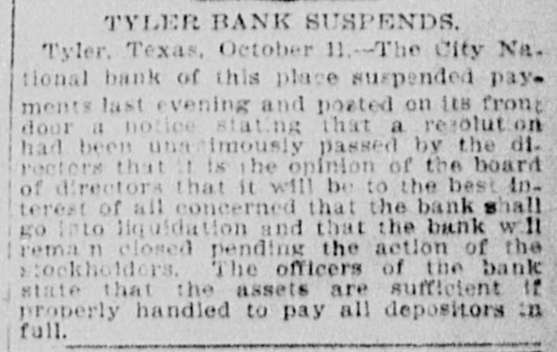 TYLER BANK SUSPENDS. Tyler. Texas, October 11.-The City Na. tional bank of this place suspended payments last evening and posted on its front door a notice stating that a resolut on had been unamimously passed by the directors that 11 is the opinion of the board of directors that it will be to the best Interest of all concerned that the bank shall go into liquidation and that the bank will remain closed pending the action of the stockholders. The officers of the bank state that the assets are sufficient If properly handled to pay all depositors in full.