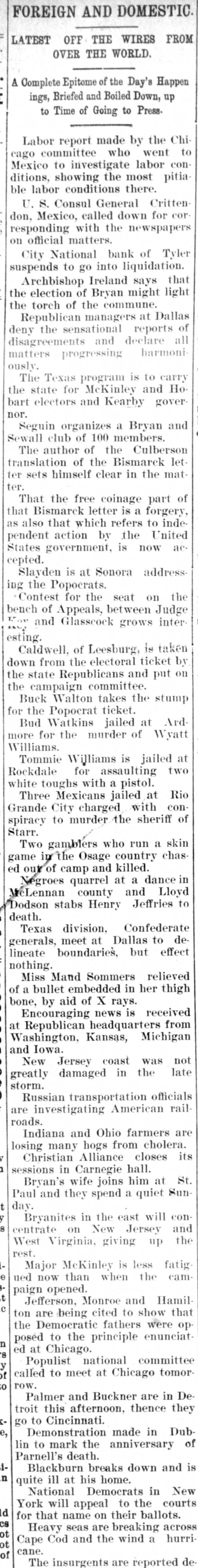 FOREIGN AND DOMESTIC LATEST OFF THE WIRES FROI OVER THE WORLD. A Complete Epitome of the Day's Happer ings, Briefed and Boiled Down, up to Time of Going to Press. Labor report made by the Chi cago committee who went to Mexico to investigate labor con ditions, showing the most pitia ble labor conditions there. U. S. Consul General Critten don, Mexico, called down for cor responding with the newspaper official matters. City National bank of Tyle suspends to go into liquidation. Archbishop Ireland says that the election of Bryan might light the torch of the commune. Republican managers at Dallas deny the sensational reports of disagreements and declare all matters progressing harmoniously. The Texas program is to carry the state for McKinley and Hobart electors and Kearby goverSeguin organizes a Bryan and Sewall club of 100 members. The author of the Culberson translation of the Bismarck letfer sets himself clear in the matThat the free coinage part of that Bismarck letter is a forgery, also that which refers to independent action by the United States government, is now accepted. Slayden is at Sonora addressthe Popocrats. Contest for the seat on the bench of Appeals, between Judge For and Glasscock grows interesting. Caldwell, of Leesburg, is taken lown from the electoral ticket by the state Republicans and put on the campaign committee. Buck Walton takes the stump for the Popocrat ticket. Bud Watkins jailed at Ardmore for the murder of Wyatt Williams. Tommie Williams is jailed at Rockdale for assaulting two white toughs with a pistol. Three Mexicans jailed at Rio Grande City charged with conspiracy to murder the sheriff of Starr. Two gamblers who run a skin game in the Osage country chasOUT of camp and killed. Negroes quarrel at a dance in McLennan county and Lloyd Dodson stabs Henry Jeffries to