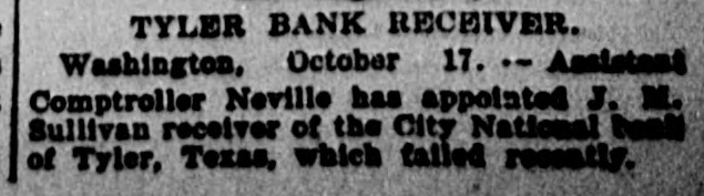 TYLER BANK RECEIVER. Washington, October 17. - Assistant Comptroller Neville has appointed J. M. Sullivan receiver of the City National teals of Tyler, Texas, which failed recently.