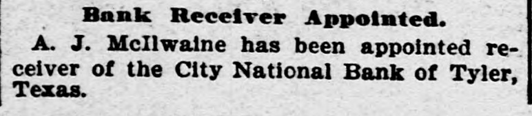 Bank Receiver Appointed. A. J. McIlwaine has been appointed receiver of the City National Bank of Tyler, Texas.