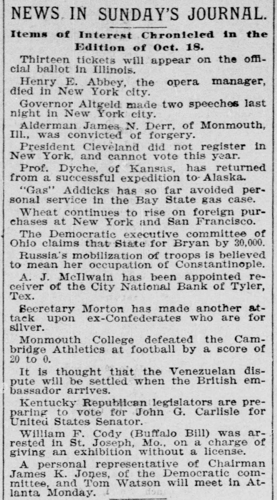 NEWS IN SUNDAY'S JOURNAL. Items of Interest Chronicled in the Edition of Oct. 18. Thirteen tickets will appear on the official ballot in Illinois. Henry E. Abbey, the opera manager, died in New York city. Governor Altgeld made two speeches last night in New York city. Alderman James N. Derr, of Monmouth, Ill., was convicted of forgery. President Cleveland did not register in New York, and cannot vote this year. Prof. Dyche, of Kansas, has returned from a successful expedition to- Alaska. "Gas" Addicks has so far avoided personal service in the Bay State gas case. Wheat continues to rise on foreign purchases at New York and San Francisco. The Democratic executive committee of Ohio claims that State for Bryan by 30,000. Russia's mobilization of troops is believed to mean her occupation of Constantinople. A. J. McIlwain has been appointed receiver of the City National Bank of Tyler, Tex. Secretary Morton has made another attack upon ex-Confederates who are for silver. Monmouth College defeated the Cambridge Athletics at football by a score of 20 to 0. It is thought that the Venezuelan dispute will be settled when the British embassador arrives. Kentucky Republican legislators are preparing to vote for John G. Carlisle for United States Senator. William F. Cody (Buffalo Bill) was arrested in St. Joseph, Mo., on a charge of giving an exhibition without a license. A personal representative of Chairman James K. Jones, of the Democratic committee, and Tom Watson will meet in Atlanta Monday.