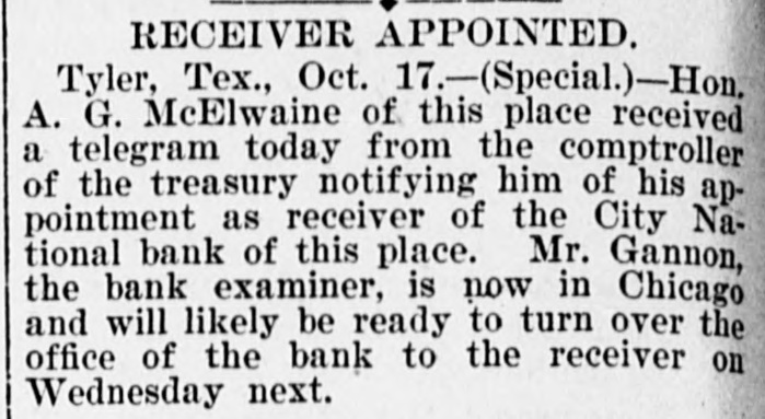 RECEIVER APPOINTED. Tyler, Tex., Oct. 17.-(Special.)-Hon. A. G. McElwaine of this place received a telegram today from the comptroller of the treasury notifying him of his appointment as receiver of the City National bank of this place. Mr. Gannon, the bank examiner, is now in Chicago and will likely be ready to turn over the office of the bank to the receiver on Wednesday next.