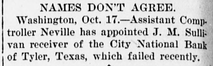 NAMES DON'T AGREE. Washington, Oct. 17.-Assistant Comptroller Neville has appointed J. M. Sullivan receiver of the City National Bank of Tyler, Texas, which failed recently.