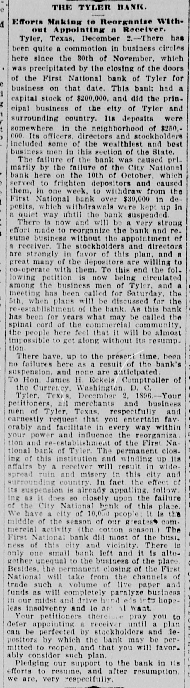 THE TYLER BANK. Efforts Making to Reorganise Withd out Appointing a Receiver. Tyler, Texas, December 2.-There has been quite a commotion in business circles here since the 30th of November, which was precipitated by the closing of the doors of the First National bank of Tyler for business on that date. This bank had a capital stock of $200,000. and did the principal business of the city of Tyler and surrounding country. Its deposits were t somewhere in the neighborhood of $250,000. Its officers, directors and stockholders included some of the wealthiest and best business men in this section of the State. The failure of the bank was caused prlmarily by the failure of the City National bank here on the 10th of October, which served to frighten depositors and caused them. in one week, to withdraw from the First National bank over $30,000 in deposits, which withdrawals were kept up In a quiet way until the bank suspended. There is now and will be a very strong effort made to reorganize the bank and re. sume business without the appointment of a receiver. The stockholders and directors are strongly in favor of this plan. and a great many of the dépositors are willing to co-operate with them. To this end the following petition is now being circulated among the business men of Tyler, and a meeting has been called for Saturday, the 5th. when plans will be discussed for the re-establishment of the bank. As this bank has been for years what may be called the spinal cord of the commercial community, the people here feel that it will be almost impossible to get along without its resumption. There have. up to the present time, been no failures here as a result of the bank's suspension. and none are anticipated: To Hon. James H. Eckels Comptroller of the Currency. Washington. D. C. Tyler. Texas, December 2, 1896.-Your petitioners. all merchants and business men of Tyler, Texas, respectfully and earnestly request that you entertain fav. orably and facilitate in every way within your power and influence the reorganiza. tion and re-establishment of the First National bank of Tyler. The permanent closIng of this institution and winding up its affairs by a receiver will result in widespread ruin and misery in this city and surrounding country. In fact. the effect of its suspension is already appalling, follow. Ing as it does so closely upon the failure of the City National bank of this place. We have a city of 10,000 people: It is the middle of the season of our greates commercial activity (the cotton season.) The First National bank did most of the busi. ness of this city and vicinity. There is only one small bank left and it is altogether unequal to the business of the place. Besides. the permanent closing of the First National will take from the channels of trade such a volume of live paper and funds as will completely paralyze business in our midst and drive hund eds into hopeless insolvency and to are 11 trant. Your petitioners therefore pray you to defer appointing a receiver until a plan can be perfected by stockholders and lepositors by which the bank may be permitted to reopen. and that you will favor. ably consider such plan. Pledging our support to the bank in its efforts to resume, and after resumption, we are, very respectfully.