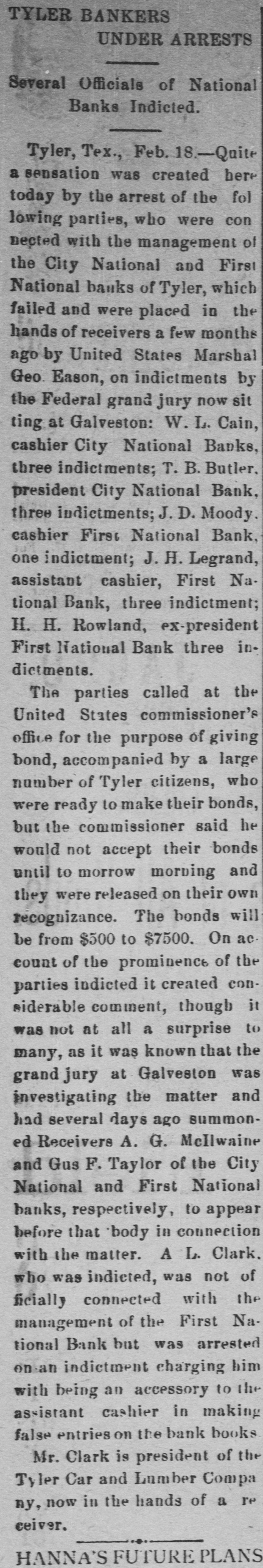 TYLER BANKERS UNDER ARRESTS Several Officials of National Banks Indicted. Tyler, Tex., Feb. 18.-Quite a sensation was created here today by the arrest of the fol lowing parties, who were con nected with the management of the City National and First National banks of Tyler, which failed and were placed in the hands of receivers a few months ago by United States Marshal Geo. Eason, on indictments by the Federal grand jury now sit ting at Galveston: W. L. Cain, cashier City National Banks, three indictments; T. B. Butler, president City National Bank, three indictments; J. D. Moody. cashier First National Bank, one indictment; J. H. Legrand, assistant cashier, First Na. tional Bank, three indictment; H. H. Rowland, ex-president First National Bank three indictments. The parties called at the United States commissioner's office for the purpose of giving bond, accompanied by a large number of Tyler citizens, who were ready to make their bonds, but the commissioner said he would not accept their bonds until to morrow morning and they were released on their own recognizance. The bonds will be from $500 to $7500. On ac. count of the prominence of the parties indicted it created considerable comment, though it was not at all a surprise to many, as it was known that the grand jury at Galveston was investigating the matter and had several days ago summoned Receivers A. G. McIlwaine and Gus F. Taylor of the City National and First National banks, respectively, to appear before that body in connection with the matter. A L. Clark. who was indicted, was not of ficially connected with the management of the First National Bank but was arrested on an indictment charging him with being an accessory to the assistant cashier in making false entries on the bank books Mr. Clark is president of the Ty ler Car and Lumber Compa ny, now in the hands of a Te ceiver. HANNA'S FUTURE PLANS