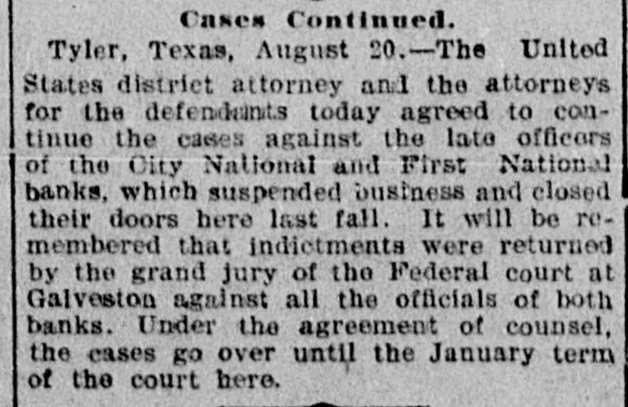 Cases Continued. Tyler, Texas, August 20.-The United States district attorney and the attorneys for the defendents today agreed to continue the cases against the late officers of the City National and First National banks, which suspended business and closed their doors here last fall. It will be remembered that indictments were returned by the grand jury of the Federal court at Galveston against all the officials of both banks. Under the agreement of counsel, the cases go over until the January term of the court here.