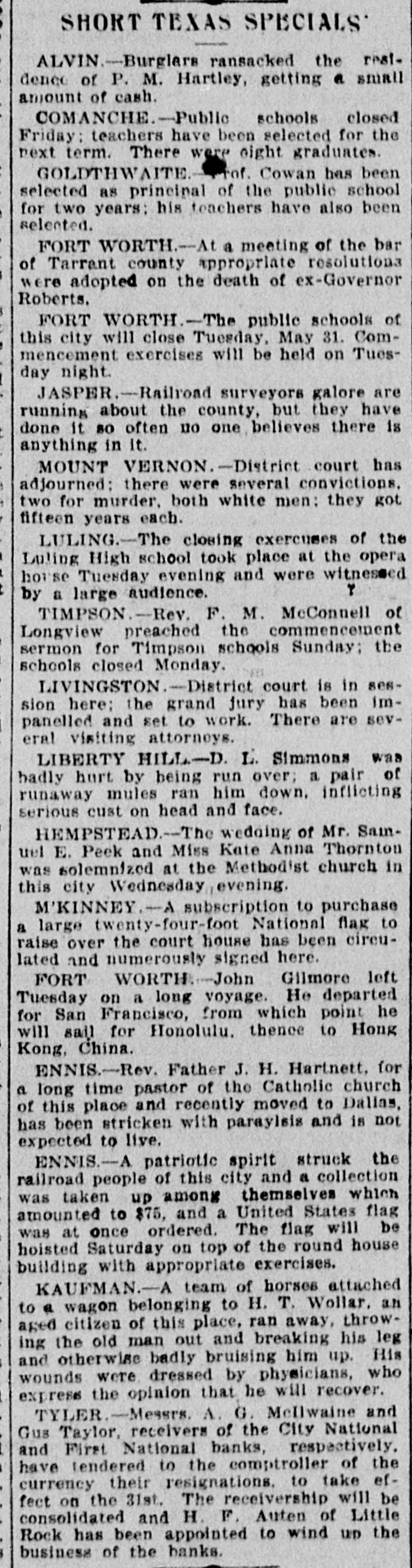 SHORT TEXAS SPECIALS ALVIN-Burglars ransacked the rest. dence of P. M. Hartley, getting a small amount of cash. COMANCHE.-Public schools closed Friday: teachers have been selected for the next term. There were eight graduates. rof. Cowan has been GOLDTHWAITE selected as principal of the public school for two years: his teachers have also been selected. FORT WORTH.--A a meeting of the bar of Tarrant county appropriate resolutiona were adopted on the death of ex-Governor Roberts. FORT WORTH.-The public schools of this city will close Tuesday, May 31. Commencement exercises will be held on Tuesday night. I . JASPER.-Railroad surveyors galore are running about the county, but they have done it so often no one believes there is e anything in it. MOUNT VERNON.-District court has s adjourned: there were several convictions. , two for murder. both white men: they got , fifteen years each. LULING.-The closing exercuses of the I Luling High school took place at the opera t house Tuesday evening and were witnessed T t by a large audience. TIMPSON.-Rev. F. M. McConnell of Longview preached the commencement sermon for Timpson schools Sunday: the schools closed Monday. LIVINGSTON.-District court is in session here; the grand jury has been impanelled and set to work. There are several visiting attorneys. LIBERTY HILL-D. L. Simmons was badly hurt by being run over; a pair of runaway mules ran him down. inflicting serious cust on head and face. HEMPSTEAD.--The wedging of Mr. Sainuel E. Peek and Miss Kate Anna Thornton was solemnized at the Method'st church in this city Wednesday, evening. M'KINNEY.- subscription to purchase a large twenty-four-foot National flag to raise over the court house has been cireulated and numerously signed here. FORT WORTH. John Gilmore left Tuesday on a long voyage. He departed for San Francisco, from which point he will sail for Honolulu. thence to Hong Kong, China. ENNIS.-Rev. Father J. H. Hartnett, for a long time pastor of the Catholic church of this place and recently moved to Dallas, has been stricken with parayisis and is not expected to live. ENNIS.-A patriotic spirit struck the railroad people of this city and a collection was taken up among themselves which amounted to $75, and a United States flag was at once ordered. The flag will be hoisted Saturday on top of the round house building with appropriate exercises. KAUFMAN.-A team of horses attached to a wagon belonging to H. T. Wollar. an aged citizen of this place, ran away, throwing the old man out and breaking his leg and otherwise badly bruising him up. His wounds were dressed by physicians, who express the opinion that he will recover. TYLER.-Messrs. A. G. Mellwaine and Gus Taylor, receivers of the City National and First National banks, respectively. have tendered to the comptroller of the currency their resignations. to take effeet on the 31st. The receivership will be consolidated and H. F. Auten of Little Rock has been appointed to wind un the business of the banks.