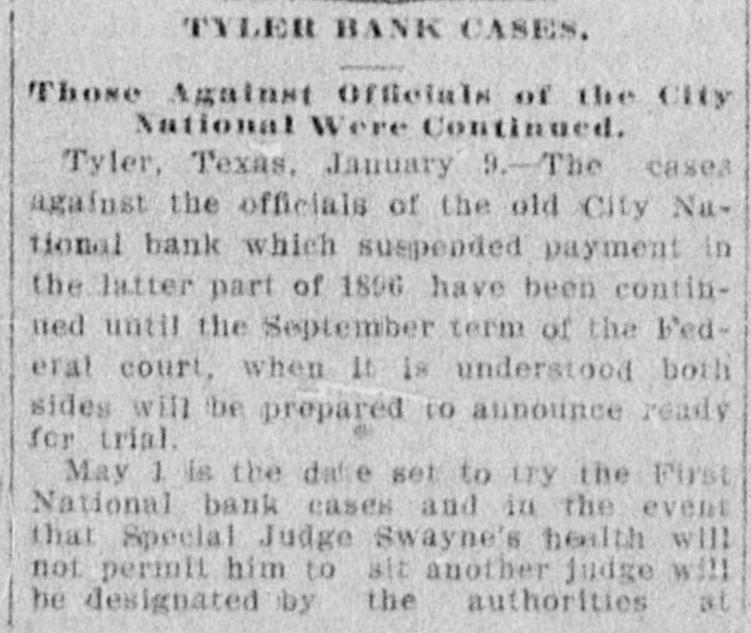 TYLER BANK CASES. Those Against Officials of the City National Were Continued. Tyler, Texas, January 9.-The cases against the officials of the old City Nutional bank which suspended payment in the latter part of 1896 have been continned until the September term of the Wederat court, when 16 is understood both sides will be propared to aunounce ready for trial. May 1. is the date set to try the First National bank cases and in the event that Special Judge Swayne's health will not permit him to sit another judge will be designated by the authorities at