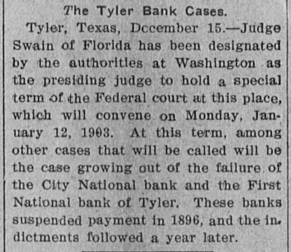 The Tyler Bank Cases. Tyler, Texas, December 15.-Judge Swain of Florida has been designated by the authorities at Washington as the presiding judge to hold a special term of the Federal court at this place, which will convene on Monday, January 12, 1903. At this term, among other cases that will be called will be the case growing out of the failure of the City National bank and the First National bank of Tyler. These banks suspended payment in 1896, and the in. dictments followed a year later.