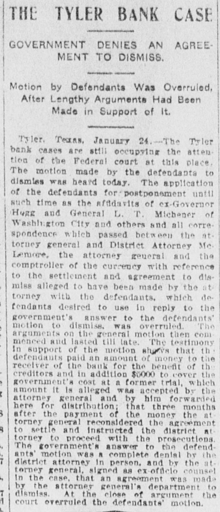 The last witness this afternoon was S. A. Fain, who was secretary of the Tyler Car and Lumber company. His testimony so far has only been in reference to the entries in the books.