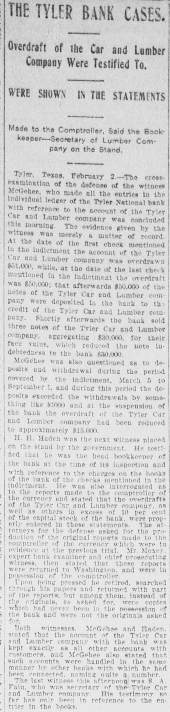 Tyler, Texas, February 2.-The cross-examination of the defense of the witness McGehee, who made all the entries in the individual ledger of the Tyler National bank with reference to the account of the Tyler Car and Lumber company was concluded this morning. The evidence given by the witness was merely a matter of record.