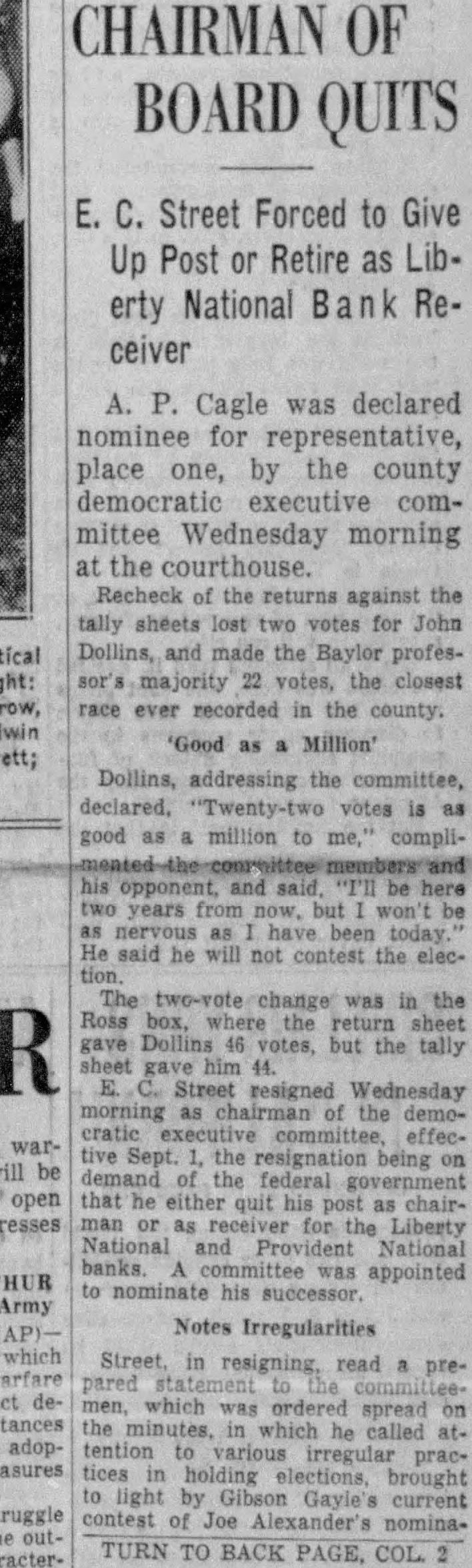 CHAIRMAN OF BOARD QUITS E.C. Street Forced to Give Up Post or Retire as Liberty National Bank Receiver A. P. Cagle was declared nominee for representative, place one, by the county democratic executive committee Wednesday morning at the courthouse. Recheck of the returns against the tally sheets lost two votes for John Dollins, and made the Baylor profèsmajority 22 votes, the closest race ever recorded in the county. Good as Million' Dollins, addressing the committee, declared, "Twenty-two votes is as good as a million to complihis opponent, and said, "I'll be here two years from now, but won't be as nervous as have been today. He said he will not contest the elecThe two-vote change was in the Ross box, where the return sheet gave Dollins votes, but the tally sheet gave him 44. E. Street resigned Wednesday morning as chairman the democratic effective Sept the resignation being on demand of the federal that he either quit his post as chairman or as receiver for the Liberty National and Provident National banks. committee was appointed to nominate his successor. Notes Irregularities Street, in resigning, read prepared men, which was ordered spread on the minutes. in which he called attention to various irregular practices in holding elections, brought to light by Gayle's current contest of Joe Alexander's nominaTURN TO BACK PAGE. COL.