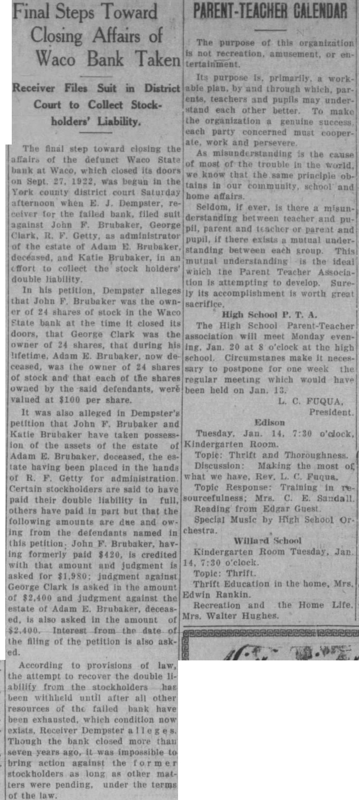 Final Steps Toward Closing Affairs of Waco Bank Taken Receiver Files Suit in District Court to Collect Stockholders' Liability. The final step toward closing the As the cause affairs of the defunct Waco State of most of the trouble the bank at Waco, which closed its doors know that the same principle on Sept 27, 1922, was begun in the tains in our community, school and York county district court Saturday home affairs afternoon when Dempster, Seldom, if ever, is there misun ceiver for the failed bank, filed suit derstanding teacher and against John Brubaker, George pil, parent and teacher or parent and Clark, R. Getty, as administrator pupil, if there exists mutual underof the estate of Adam E. Brubaker standing between each group. deceased, and Katie Brubaker, in an mutual understanding is the ideal offort to collect the stock holders' which the Parent Teacher Associadouble liability tion is attempting to develop. In his petition, Dempster alleges its accomplishment is worth great that John Brubaker was the owner of 24 shares of stock in the Waco High School State bank at the time It closed its The High School doors, that George Clark was the association will meet Monday evenowner of 24 shares, that during his ing. Jan. 20 at o'elock at the high lifetime, Adam Brubaker, now de school. Circumstanes make it necesceased, was the owner of 24 shares sary to postpone for one week the of stock and that each of the shares regular meeting which would owned by the said defendants, were been held on Jan. 13. valued at $100 per share. L. It was also alleged in Dempster's President petition that John F. Brubaker and Edison Katie Brubaker have taken possess- Tuesday, Jan. 14. o'clock, ion of the assets of the estate of Kindergarten Room. Adam E. Brubaker. deceased, the es- Topic Thrift and Thoroughness Discussion Making the most tate having been placed in the hands of R. Getty for administration what we have, Rev. Fuqua, Certain stockholders are said to have Topic Response: Training in sourcefulness; Mrs. E. Sandall paid their double liability in full, Reading from Edgar Guest others have paid in part but that the Special Music by High School Or following amounts are due and chestra. ing from the defendants named School this petition. John F. Brubaker, havKindergarten Room Tuesday, Jan Ing formerly paid $420, is credited 14, o'clock with that amount and judgment Topic Thrift asked for $1,980: judgment against Thrift Education in the home, Mrs. George Clark is asked in the amount Edwin Rankin. of and judgment against the Recreation and the Home Life. estate of Adam E. Brubaker, deceasMrs. Walter Hughes. ed, is also asked in the amount of Interest from the date of the filing of the petition is also asked. According to provisions of law, the attempt to recover the double ability from the stockholders has been withheld until after all other resources of the failed bank have been exhausted. which condition exists, Receiver Dempster Though the bank closed more than seven years ago, was impossible bring action against the stockholders as long as other matters were pending, under the terms of the law.